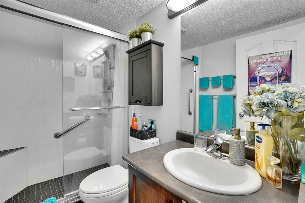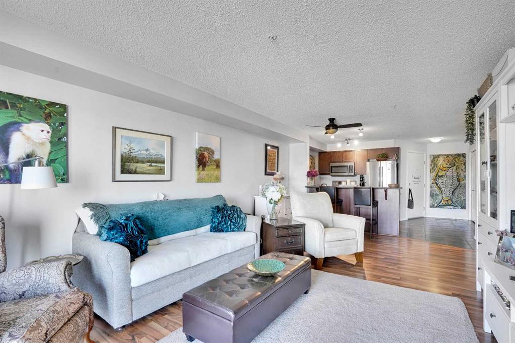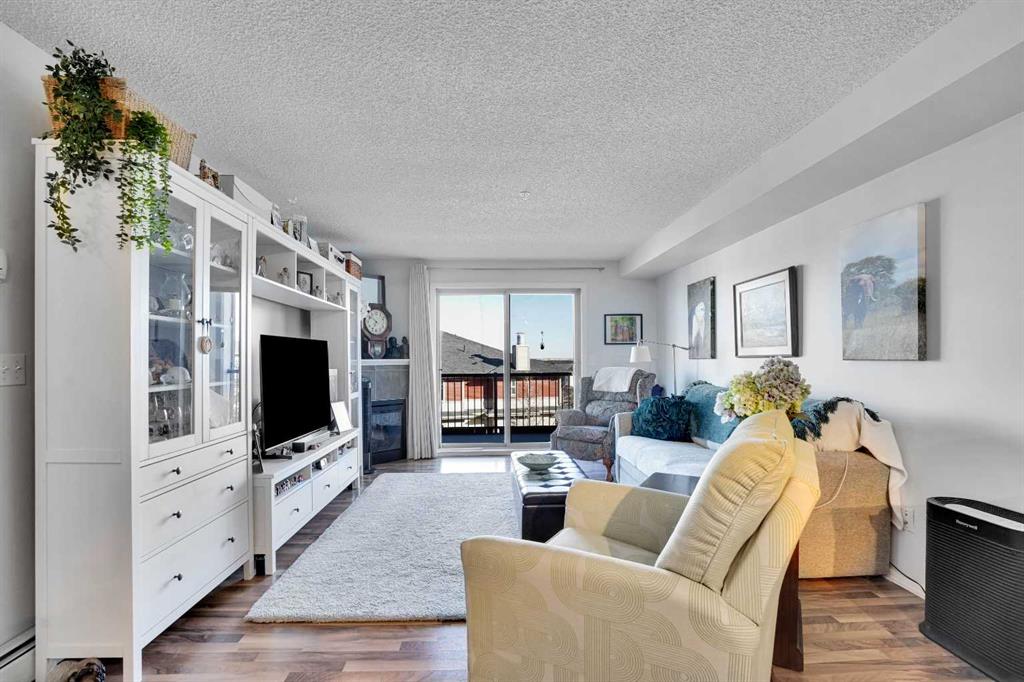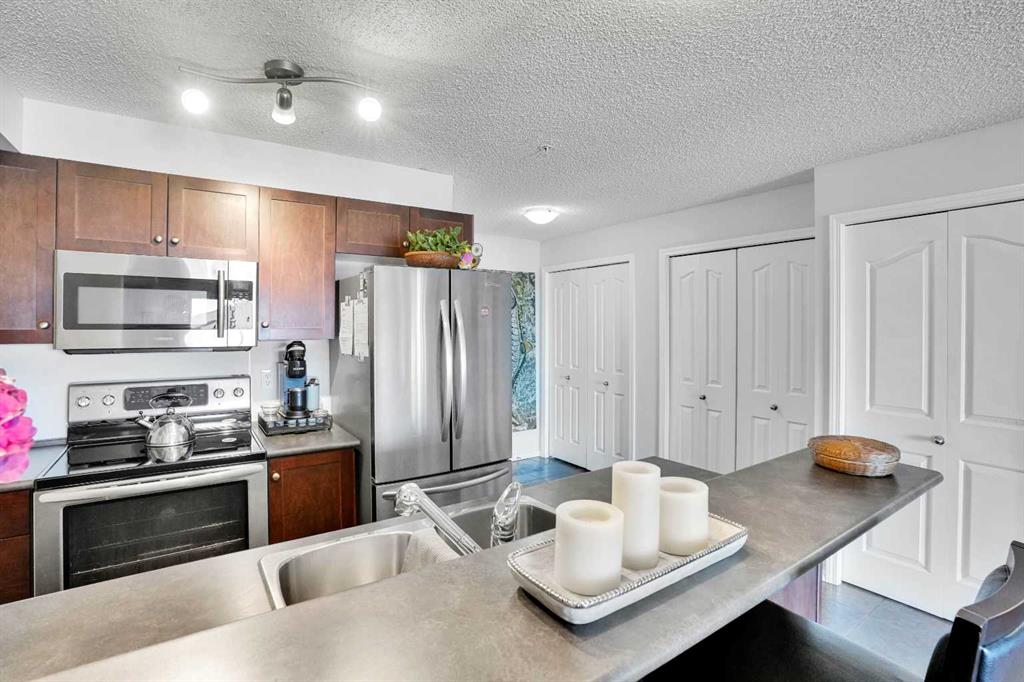 Welcome Home! This sweet condo is absolutely perfect for those who want a peaceful place to call their own. You can feel it as soon as you step into the suite. This corner suite overlooks walking paths, community spaces and greenery and the east exposure guarantees bright mornings. A generous size balcony is accessed through sliding patio doors from the living room: add some patio furniture, then sit back and enjoy the view. Tastefully decorated and well kept with dark stained wooden cabinetry, ceramic floor in the entry, kitchen and bathroom, laminate flooring in the living room and dining area, raised breakfast/casual/dining counter and upgraded appliances. The corner electric fireplace adds to the ambiance of this home. When it’s cold outside, the heater fan can be turned on to gently warm the living area. Can you say “cozy”…?? There is abundant storage in the closets with built in shelving and space savers. An oversized, tiled, walk in shower in the main bath is both beautiful and functional. Care and thought was absolutely put into its design. Pride of ownership is both felt and seen in every part of this delightful condo. Walking distance to shopping complex with Shopper’s Drug Mart, Save-On-Foods, banks, restaurants and… of course…. a Timmy’s. A short drive will take you to the full Country Hills Shopping complex boasting a theatre, flower shops and the Calgary Public Library at Country Hills! CrossIron Mills is 15 minutes away. If you don’t drive, Calgary Transit offers good service with connections at the North Pointe Terminal that’s beside the Country Hills Complex. Check out the Panorama Pointe Community Centre, an active and expansive recreation facility for the area. A golf course is close by. Your designated parking stall #15 with power is right in front of the building. Condo fees include all utilities, even electricity. This home offers affordable, low maintenance living in a lovely area of Calgary. Contact your realtor to see it today!!