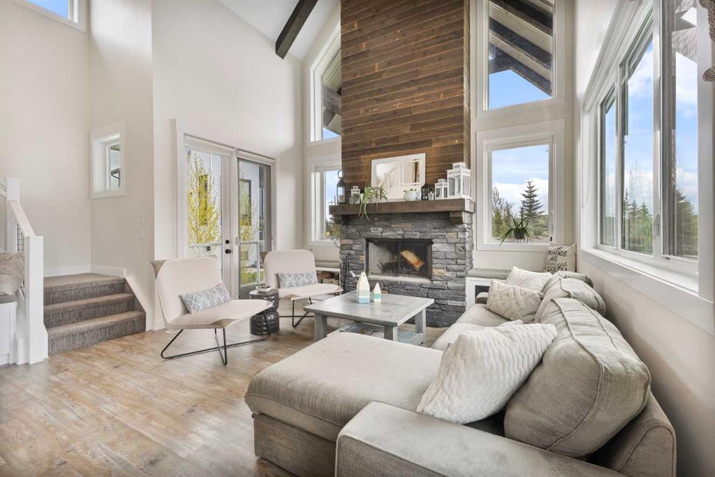 Welcome to your dream lake retreat at Ghost Lake – a truly exceptional property nestled on the largest developed lot in this prestigious gated community. This elegant and thoughtfully designed home backs onto a tranquil green space, offering the perfect blend of privacy, natural beauty, and high-end living. The luxury touches throughout such as premium triple-pane windows, offering superior comfort and energy efficiency along with the beautiful copper roof accents add timeless elegance and durability, reflective of the home’s commitment to quality craftmanship. Step inside the main house and be greeted by a breathtaking 21-foot vaulted ceiling that crowns the open-concept main floor. The wood-burning fireplace creates a cozy and inviting atmosphere, ideal for relaxing after a day on the lake or entertaining friends and family. A stylish powder room adds convenience and charm to the space.
