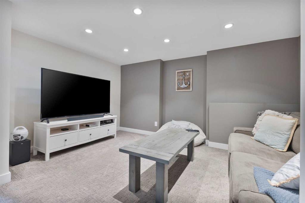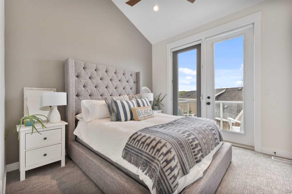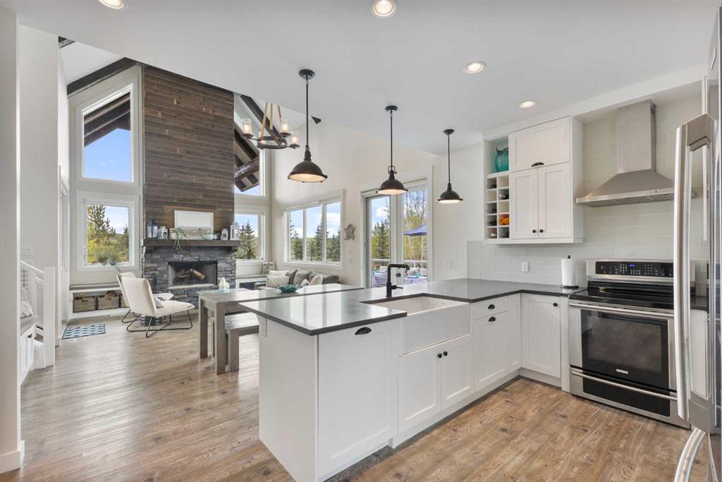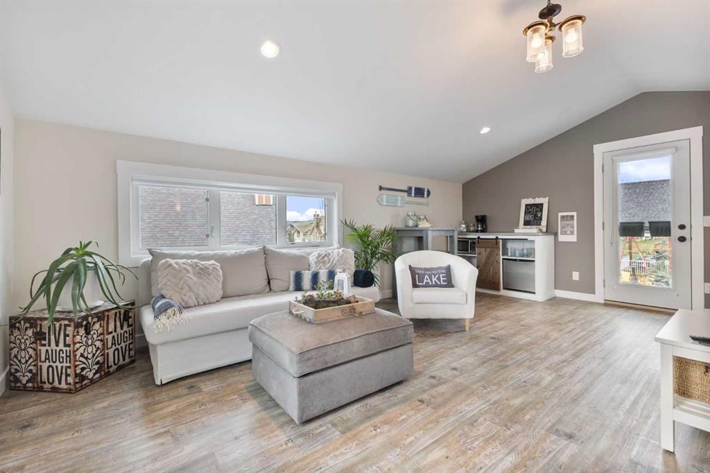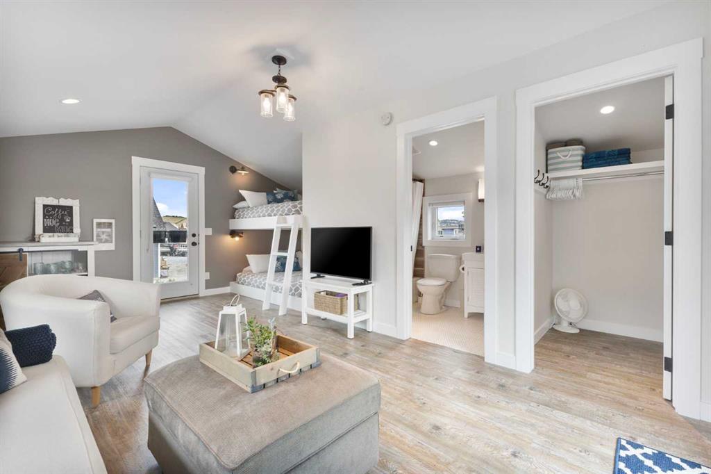 Upstairs, you’ll find a cozy bunk room that sleeps four, perfect for kids or guests, alongside the primary bedroom and a 3-piece bathroom. The fully finished basement extends your living space with a generous recreation room and hosts the laundry area, offering both comfort and practicality. The magic continues outdoors where a wraparound deck invites you to host unforgettable gatherings under the stars. Lounge by the second wood-burning fireplace, unwind in the inflatable hot tub, or simply soak in the peaceful surroundings of this dark sky community. A separate carriage house offers even more flexibility, featuring its own coffee bar, queen sized bunk beds, and another 3-piece bathroom – perfect for hosting extended family, guests, or creating a private retreat space. As part of this exclusive lakeside community, you’ll enjoy unmatched amenities including lake access, an indoor pool, hot tub, tennis courts, fitness facility, community dock, kitchen, and beach volleyball courts – all set against the stunning backdrop of the Rocky Mountains.