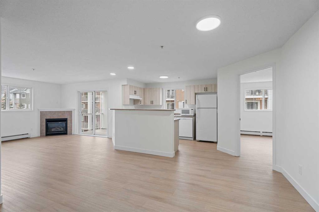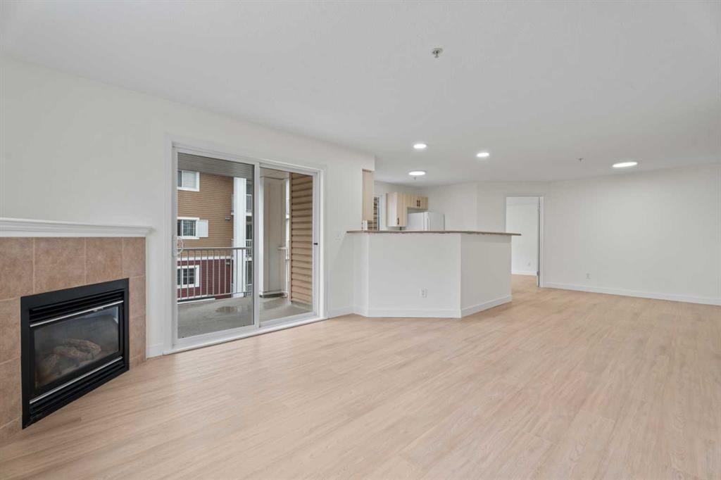 The kitchen has been thoughtfully updated with brand newly faced cabinets and hardware, offering a clean and stylish look while maintaining functionality at its core. Dishwasher new in 2025. The inviting living area is anchored by a cozy fireplace—perfect for relaxing evenings—and extends out to a private balcony, ideal for your morning coffee or unwinding at the end of the day. This unit also come with 1 titled parking stall right across from the entrance to the elevator.