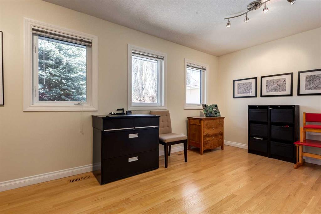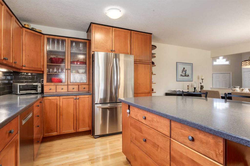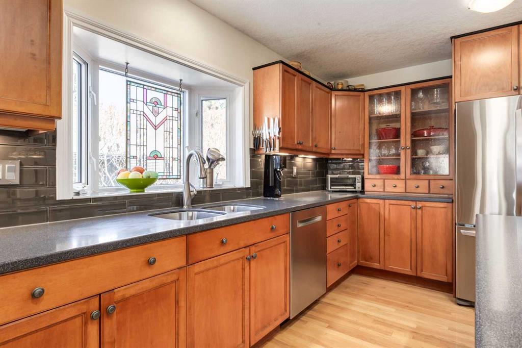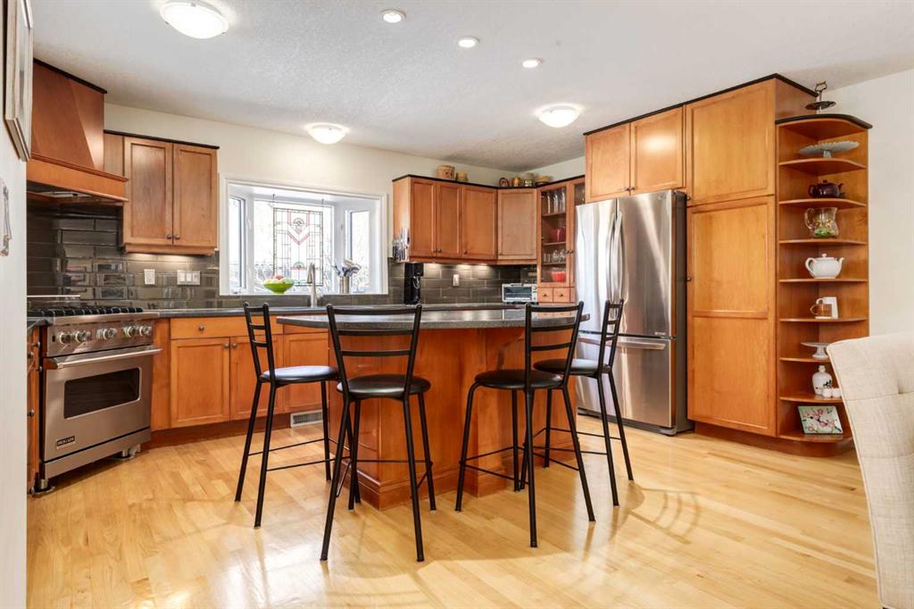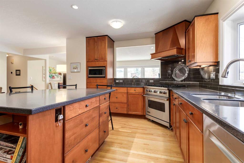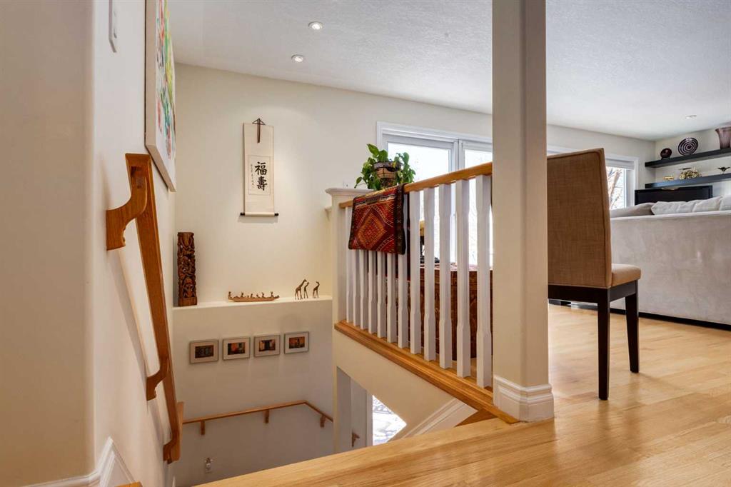 Welcome to your private sanctuary in the highly sought-after community of Wildwood, where opportunities like this are rarely offered. Perched on the ridge on nearly one-third of an acre and backing directly onto Edworthy Park, this exceptional property captures sweeping west-facing views, complete privacy, and seamless access to nature, all just minutes from everyday amenities and a quick commute to downtown. Lovingly maintained and thoughtfully updated by the same owners for the past 28 years, this is a home that truly stands apart. A spacious tiled entry welcomes you in, complete with a walk-in closet and direct access to the oversized (29’3 x 21’4), heated attached garage. Featuring a rare 3-metre extension, this space is ideal for a workshop, additional storage, or hobby area. The main level opens into a bright, open-concept design, anchored by solid oak hardwood flooring throughout. At the heart of the home is a beautifully appointed, chef-inspired kitchen with custom cabinetry, a large island, and generous prep and gathering space, perfectly suited for both intimate dinners and larger-scale entertaining. The seamless connection to the dining and living areas creates a warm, inviting atmosphere designed for hosting and everyday living alike. The living room offers a cozy yet refined setting, complete with a gas fireplace, custom built-ins, and a reinforced wall ready for a home theatre setup. From here, step out onto the expansive west-facing patio, an ideal backdrop for summer evenings. The primary retreat is a peaceful escape, featuring a walk-in closet, private 3-piece ensuite, and direct access to a secluded patio, perfect for enjoying your morning coffee. The main floor is completed by a well-appointed 4-piece bathroom and a generous office space, originally designed as two bedrooms and easily convertible back, offering the flexibility of a three-bedroom layout on the main level if desired. The fully developed walkout lower level extends your living and entertaining space, offering a large recreation and media area. Two additional bedrooms with oversized south-facing windows bring in an abundance of natural light, while the laundry room and a spacious heated crawl space provide exceptional functionality and storage. Step outside from the lower level to a second patio, complete with a concrete pad for a hot tub, garden swing and a gas line for your BBQ. The backyard is truly extraordinary – expansive, private, and featuring a fire pit surrounded by mature trees, it’s a rare and magical setting that offers year-round enjoyment. Notable features and upgrades include energy-efficient Pella Insulshield windows and doors in the living room, a full-width electric awning, central air conditioning, a 12-zone automatic sprinkler system, newer upper deck, and a newer hot water heater (2024).
