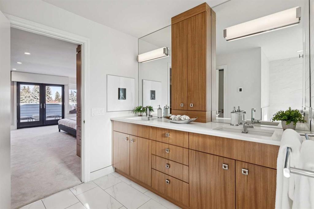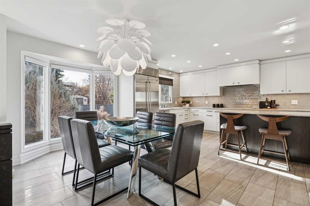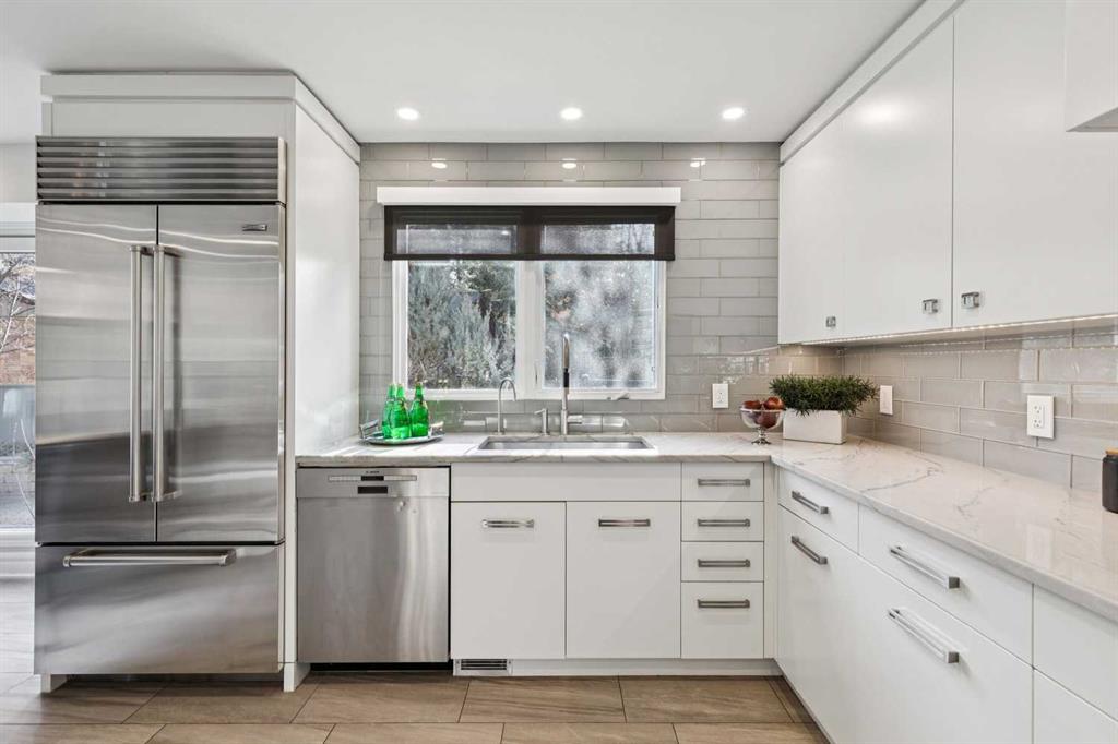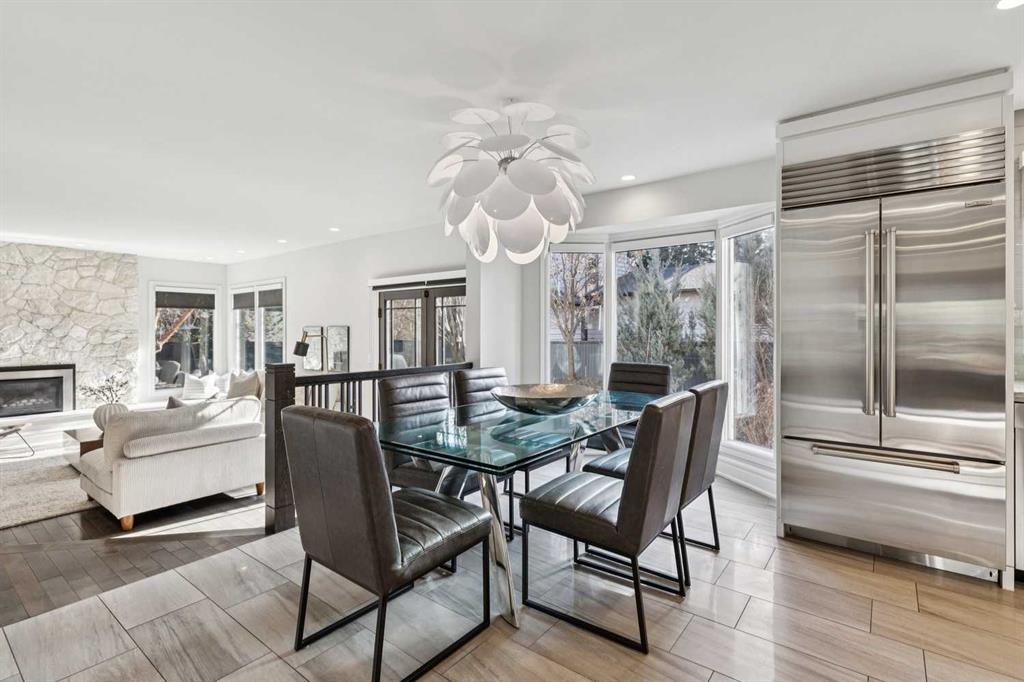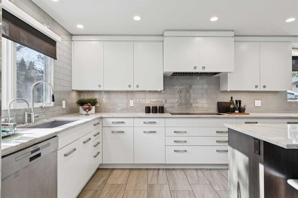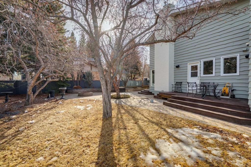 Bright + beautifully renovated executive family home with pleasing curb appeal, highlighted by a large covered front patio complete with heater — perfect for enjoying the outdoors year-round. This home shows beautifully + offers a warm, welcoming entrance that opens to a spacious living room with soaring ceilings + a huge picture window that fills the space with natural light. The chef’s kitchen is designed for both everyday living + entertaining, featuring abundant cabinetry + counter space, professional stainless steel appliances, a large island with seating + a generous informal dining area. Just steps down is the comfortable family room with a striking stone feature wall, gas fireplace, built-in shelving + wall-mounted TV. Oversized patio doors lead directly to the landscaped backyard. Upstairs you’ll find three well-sized bedrooms, convenient laundry + a family bath, along with a fantastic primary retreat. The primary bedroom is exceptionally spacious, offering extensive ample closing space, a spa-inspired ensuite + a huge private deck. The fully developed lower level adds even more living space with a large recreation room, bathroom with full steam room, guest bedroom + excellent storage. The big backyard is ideal for play + entertaining, complete with a fire pit. Additional highlights include fresh neutral paint, hardwood flooring, stylish light fixtures, lush carpeting + a double attached garage. Ideally located close to off-leash areas, parks, schools, Rockyview hospital + all amenities.