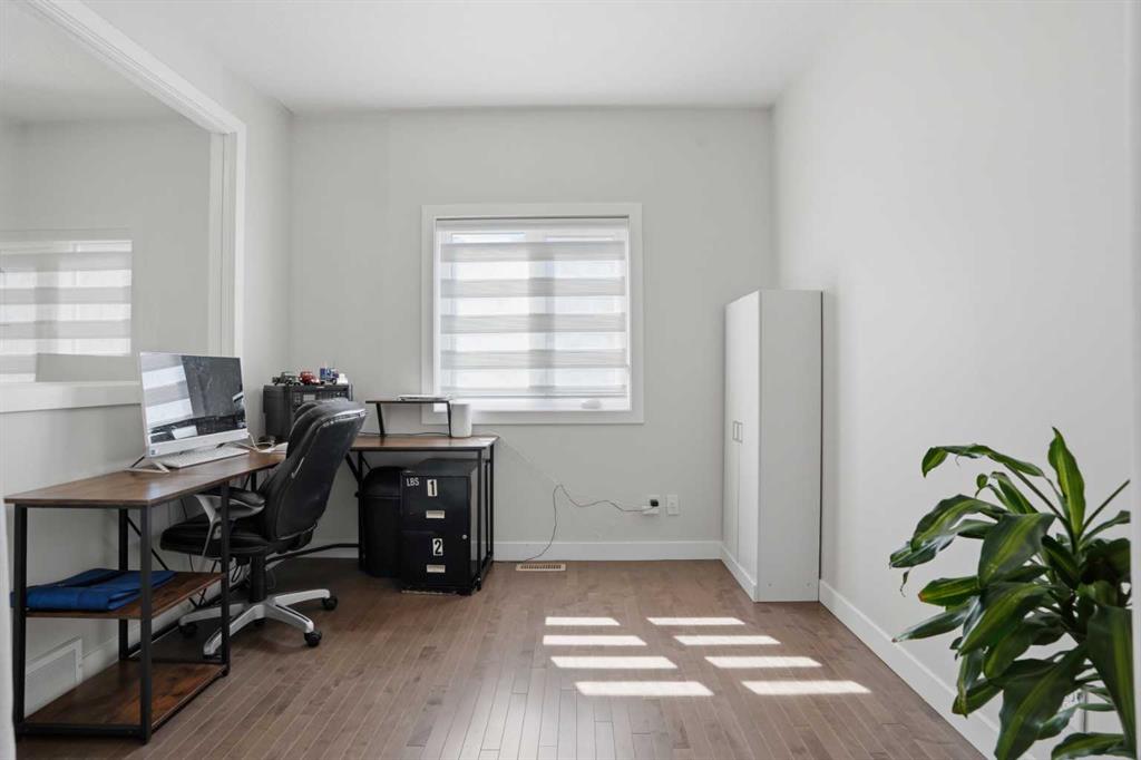 The main level features soaring ceilings and an open-concept layout, enhanced by oversized windows that flood the space with natural light. A dedicated front office provides a quiet and private workspace, ideal for remote professionals or a flex room. The living room is both stylish and cozy, anchored by a striking fireplace and a marbled feature wall that adds a touch of elegance.
