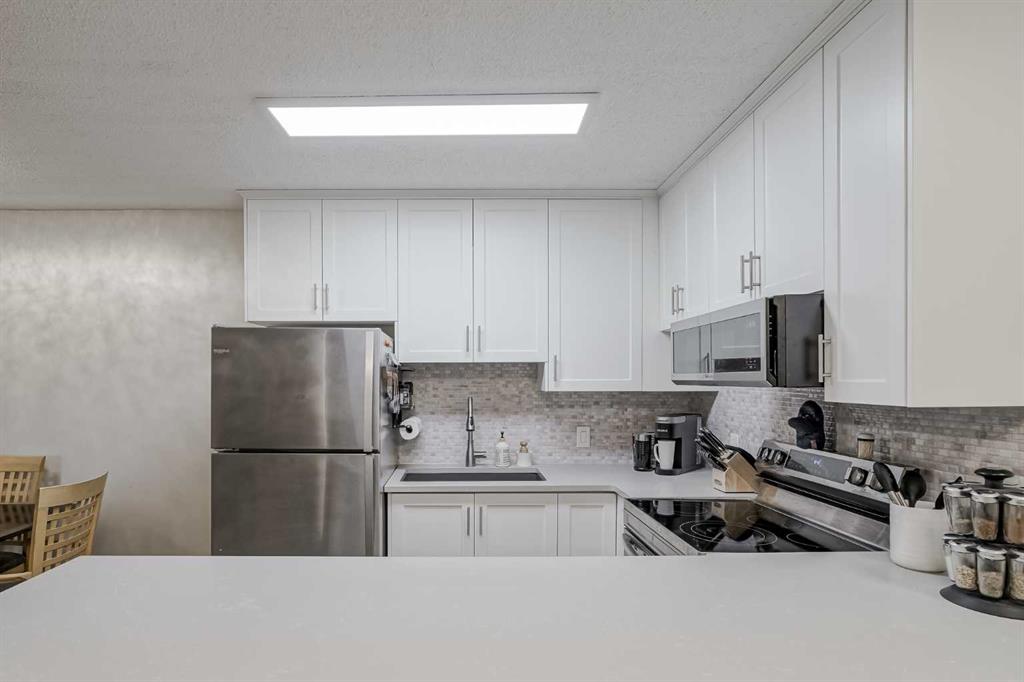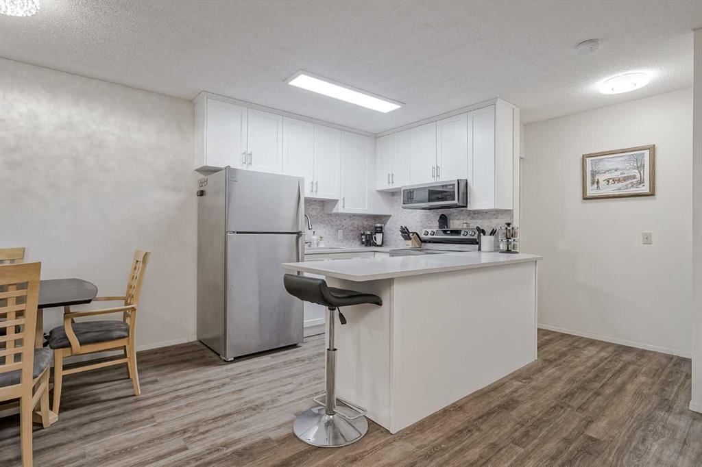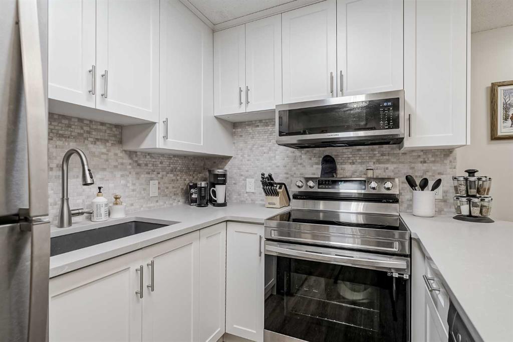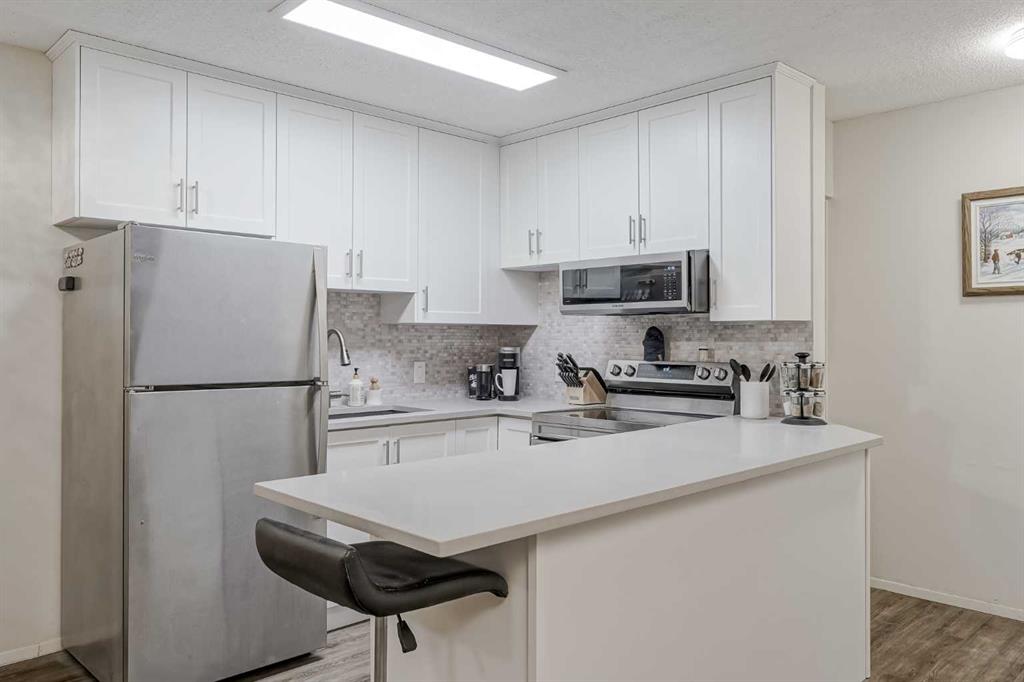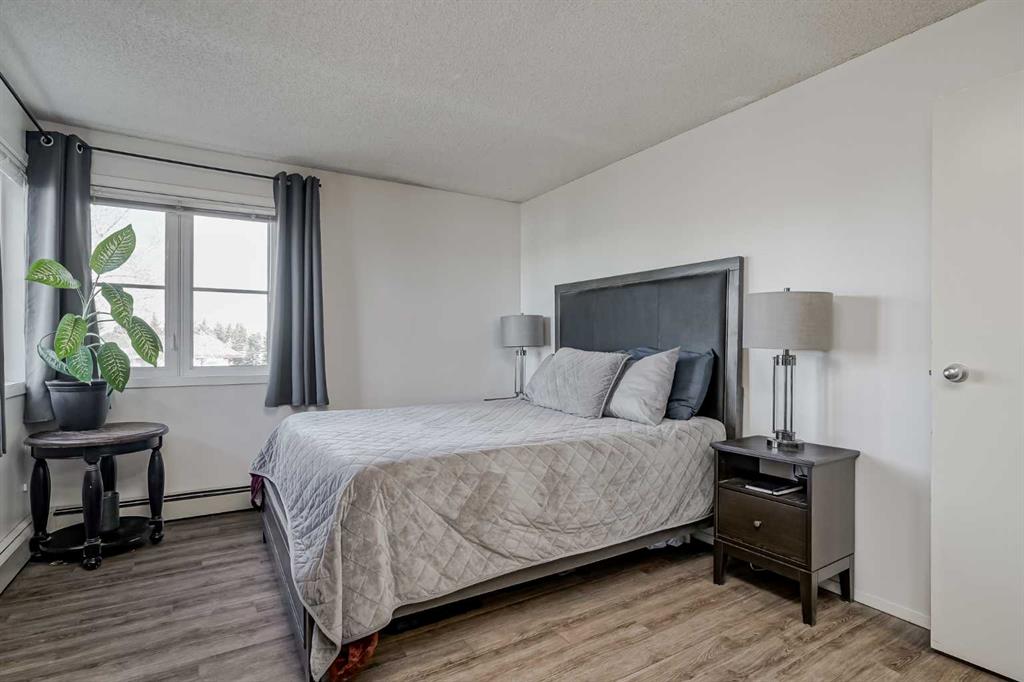 Welcome to Edgecliffe Estates. This TOP FLOOR , CORNER UNIT is 2 bedroom, 2 bathroom, wonderfully updated and makes for a perfect home in one of Calgary’s most sought after complexes. As you enter you are greeted with gorgeous laminate floors that lead you into your open floor plan living space. At over 880 square feet this home feels large and includes a fully updated kitchen with ample amount of cabinets, beautiful quartz counter tops and newer appliances. Adjacent to your kitchen is your dining space and your living room equipped with a gas fire place and north facing balcony overlooking a green space. This home is great for entertaining or for quiet nights at home with the family. Your primary bedroom is large enough for a king size bed, additional bedroom furniture and features it’s own ensuite bathroom with a walk-in shower. The second bedroom is very large as well and is just next to the newly renovated second bathroom. The home has ample storage and in-suite washer and dryer. Edgecliffe Estates has some of the most amazing amenities included with your condo fees starting with a large indoor pool, fitness centre, party room and additional guest parking. You are steps to nose hill and some of the most amazing biking and hiking trails as well as quick access to downtown, market mall, northland mall, great schools and the airport. Edgemont is truly one of Calgary’s premier communities, do not miss out on this opportunity to own this amazing home!
