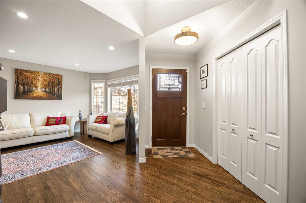Welcome to this stunning Home in Edgemont, 4+1 bedroom, 3.5 bath family home offering over 3,300 sq ft of total living space and central air conditioning—a perfect blend of space, comfort, and style. Step inside and be greeted by a soaring 2 storey foyer and gleaming hardwood flooring throughout the main floor, and up to the second level hallway that sets the tone for the home. To your right, the sun-filled East-facing Living room and formal Dining room and great for your family gathering. Newly upgraded Kitchen with Maple cabinets full height to the ceiling, centre island, granite countertops, stainless steel appliances, and pantry that you will love to prepare your meals for your family. The Family room with gas fireplace and breakfast nook lead you to a vinyl deck with glass panel and aluminum railing, ideal for everyday enjoyment. Completing the main floor are a Den perfect for your home office and a powder room.