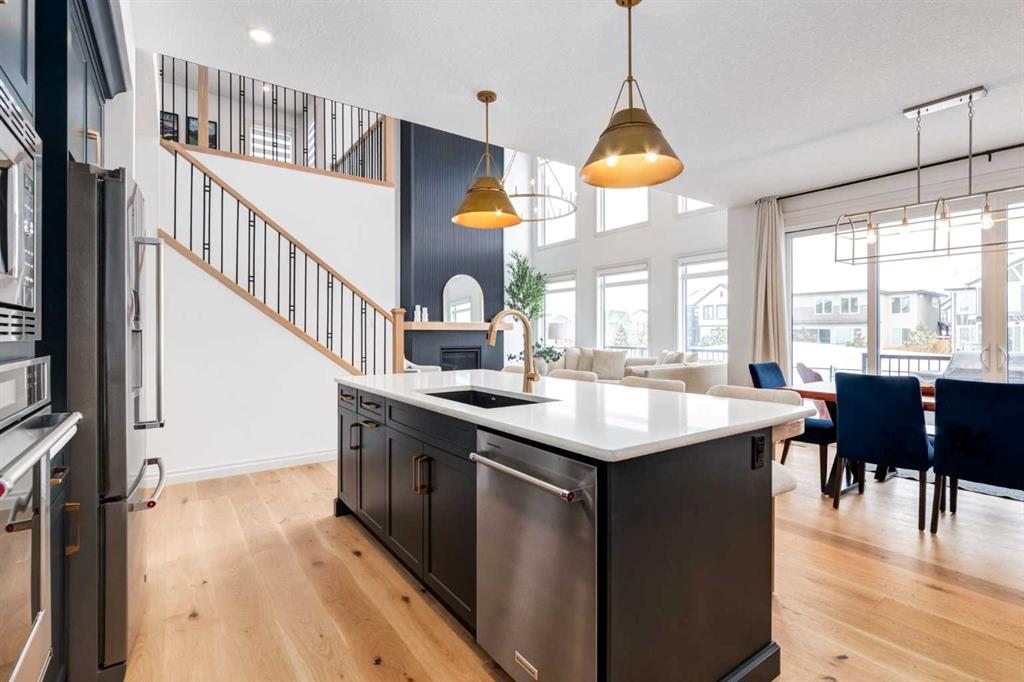 Welcome to this exceptional estate home in the sought after community of Rockland Park, masterfully built by Morrison Homes, offering a perfect blend of luxury and functionality and backing onto greenspace for added privacy and a serene setting. From the moment you step inside, you are welcomed by rich hardwood floors that flow throughout the main level, setting the tone for the home’s exceptional craftsmanship. A spacious office/den, enclosed by striking double glass doors, provides the perfect space to work or unwind. As you continue, the home opens dramatically into a breathtaking open-to-above living room, where soaring ceilings and a stunning floor-to-ceiling fireplace with custom panelling create a true showpiece. Expansive windows flood the space with natural light, while motorized blinds throughout add an extra layer of comfort and convenience. The beautifully appointed kitchen is truly the heart of the home, showcasing custom cabinetry with elegant gold hardware and upgraded stainless steel appliances, perfect for the chef in the family. A custom wood hood fan serves as a striking focal point, while the butler’s pantry, complete with a beverage fridge, and a separate walk-in pantry offer exceptional storage and functionality, adding both style and convenience. The space flows effortlessly into the spacious dining area and out onto the full width deck, creating the perfect setting to gather with family and friends. A functional mudroom with built-in lockers and a 2-piece powder room featuring premium finishes completes the main level. Upstairs features a bright and versatile bonus room open to below, a well designed laundry room with a folding counter, two generously sized secondary bedrooms, and a luxurious primary retreat complete with a spa-inspired ensuite and a custom walk-in closet with built-ins. The fully finished basement further expands your living space, offering a theatre area, a wet bar complete with sink and fridge and an additional bedroom or gym, featuring a large walk-in closet, upgraded electrical, and gym-ready flooring. Additional highlights include dual furnaces and two air conditioning units for year-round comfort. As a standout feature, this home was selected by Morrison Homes to be professionally photographed for the BILD Awards, an acknowledgment of its exceptional design and craftsmanship. This is a rare opportunity to own a truly turn-key, highly upgraded estate home, still under warranty, in one of Calgary’s most desirable new communities.