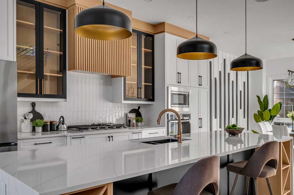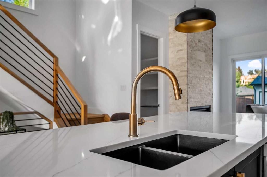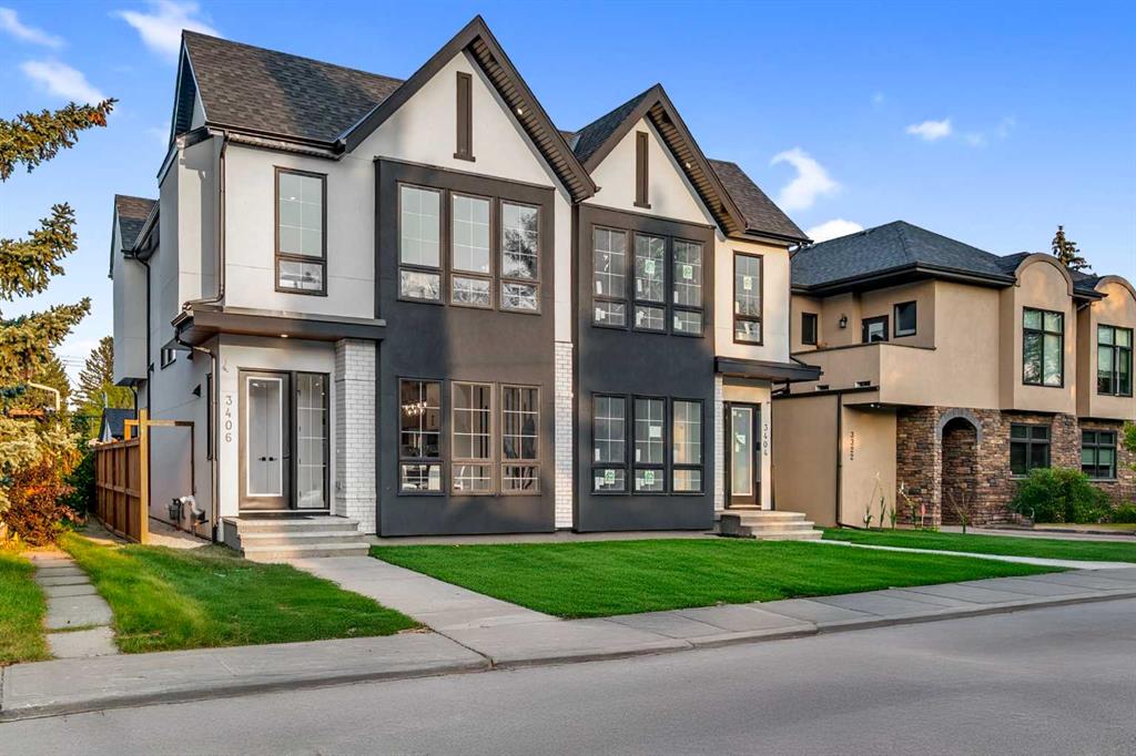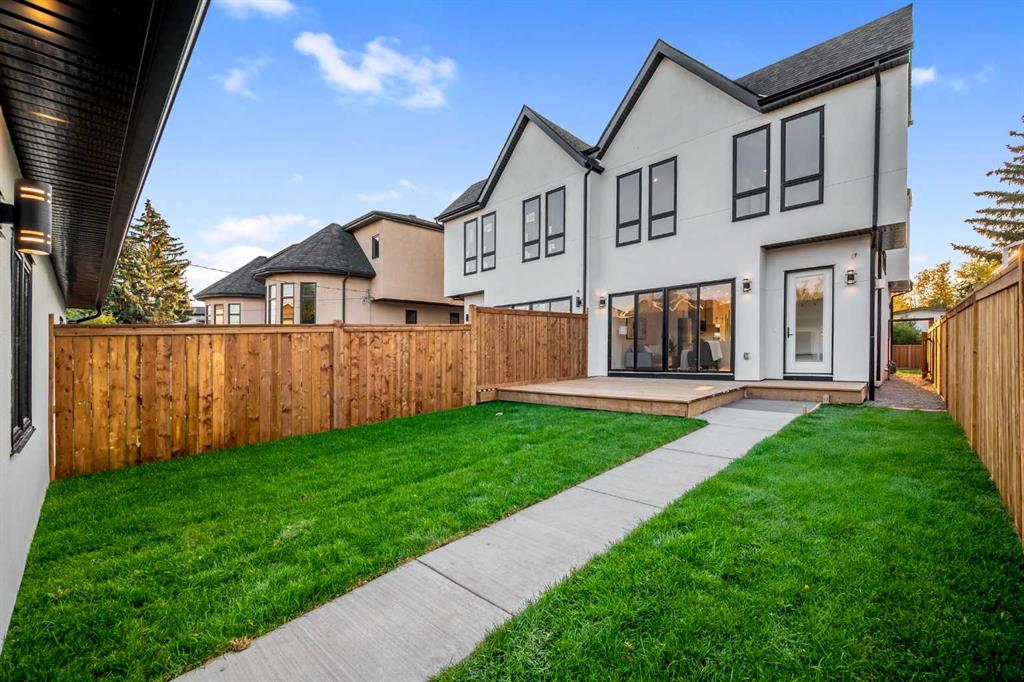 BRAND NEW | 4 BEDS | GYM | BAR | VAULTED CEILINGS THROUGHOUT | EV-POWER IN GARAGE | Only 1 Side remaining – Welcome to this stunning brand-new home in the heart of Highland Park, one of Calgary’s most sought-after neighborhoods. Ideally located near coffee shops, schools, major amenities, and just minutes from downtown, this residence blends modern luxury with everyday convenience. From the moment you arrive, the brick and stucco exterior with colonial-style windows sets an immaculate modern farmhouse tone. Inside, every detail radiates sophistication — from the upscale finishes, to the light-filled open-concept layout designed for both beauty and practicality. The main floor begins with a spacious dining area accented by a feature wall, leading into the gourmet chef’s kitchen. Here you’ll find a striking mix of paint-grade and oak cabinetry, floor-to-ceiling storage, stainless steel appliances, gas cooktop, under-cabinet lighting, and built-in ceiling speakers. The showpiece of the space is the 13-foot waterfall quartz island — perfect for entertaining or casual meals. Adjacent is a cozy living area anchored by a gas fireplace with tiled stone surround, opening to a 14×14 wood deck through a sleek glass wall system. With exterior speaker wiring, this deck is the ideal spot for BBQs, morning coffee, or summer evenings with friends. Additional main floor highlights include a walk-in pantry, custom mudroom, and an elegant powder room. Upstairs, a dramatic open-to-below design with vaulted ceilings makes a grand impression. Every bedroom on this level features a vaulted ceiling. The primary suite overlooks the front yard with sunset views, and boasts an expansive walk-in closet. The spa-inspired ensuite offers in-floor heating, a freestanding tub, dual vanity with custom mirrors, a glass shower with steamer, and exquisite finishes. Two additional bedrooms, a 4-pc bath, and a laundry room with built-in cabinetry complete the upper level. The fully developed basement is designed for both relaxation and recreation, featuring a designer wet bar, a large rec room with built-in TV unit and ceiling speakers, plus a private gym with rubber flooring and mirrors. A fourth bedroom with walk-in closet and a full bath add extra flexibility. Outside, a fully fenced backyard with generous lawn space offers room for pets, play, and summer gatherings. The double garage, roughed-in for EV charging, provides secure parking and storage. This home delivers the perfect blend of elegance, comfort, and functionality — all in one of Calgary’s most desirable communities. Contact your favorite realtor today to schedule a showing!