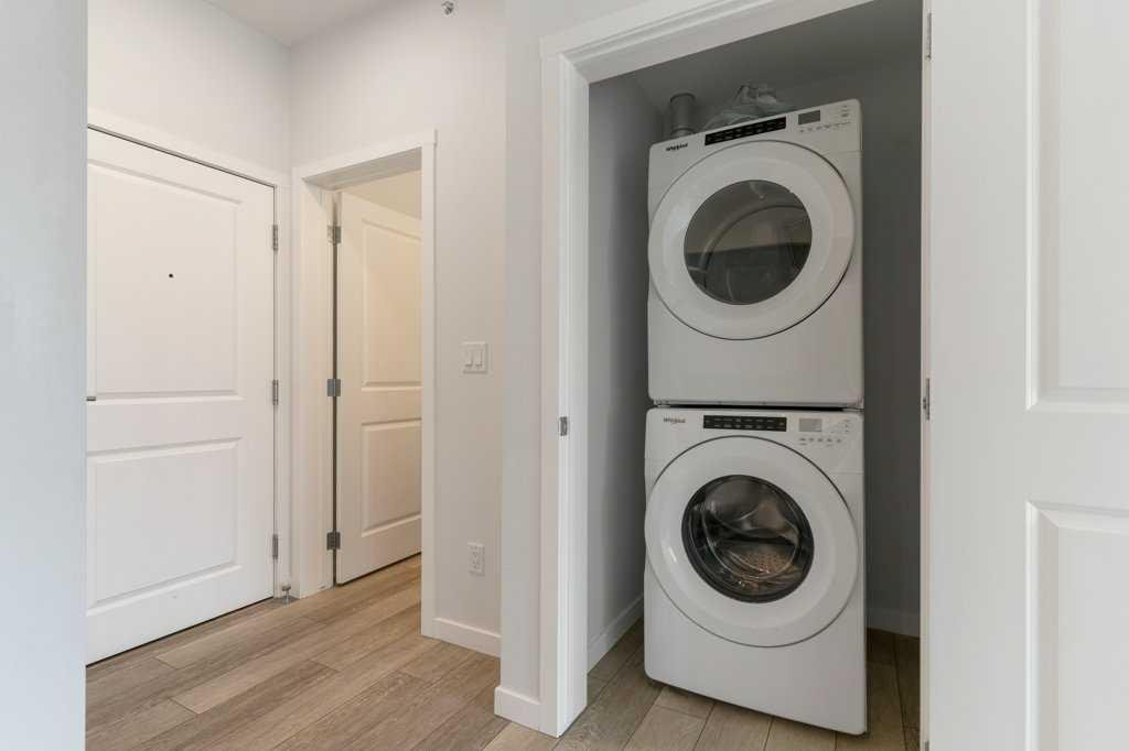 Stylish, well laid out TOP FLOOR 2 bedroom, 2 bathroom condo. Located in popular Sage Hill in the well maintained “Mark 101” by Shane Home, walking distance to shopping and amenities! Features include 9 foot ceilings, Luxury Vinyl Plank flooring and quartz counter tops throughout , vinyl windows with sleek blinds, and in-suite laundry. As you enter the unit, you will find a 4 piece bathroom, and the laundry closet. The modern Kitchen has a functional and warm feel, with dark brown laminate finished cabinets, quartz countertops, modern white subway tile backsplash and stainless steel appliances. Opening on to the kitchen is the family room with a large, bright, sunny window and a patio door leading to your private covered balcony, with gas line roughed in. The primary bedroom has an en-suite bathroom and double closets. The second bedroom is across the family room from the primary allowing for maximum privacy. This unit also includes 1 titled underground parking stall, a storage locker, and there is secure bike storage available in the parkade. Condo fees are affordable and include heat/water/sewer. Located just steps away from public transit, shopping, restaurants, and many other amenities, this is a GREAT place to live OR a wonderful investment property.