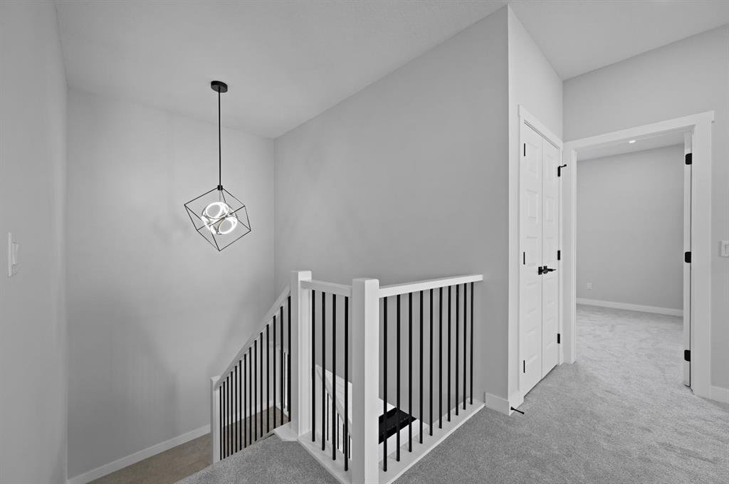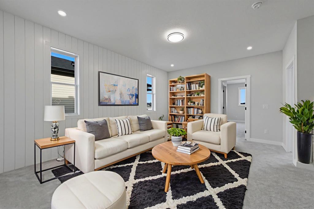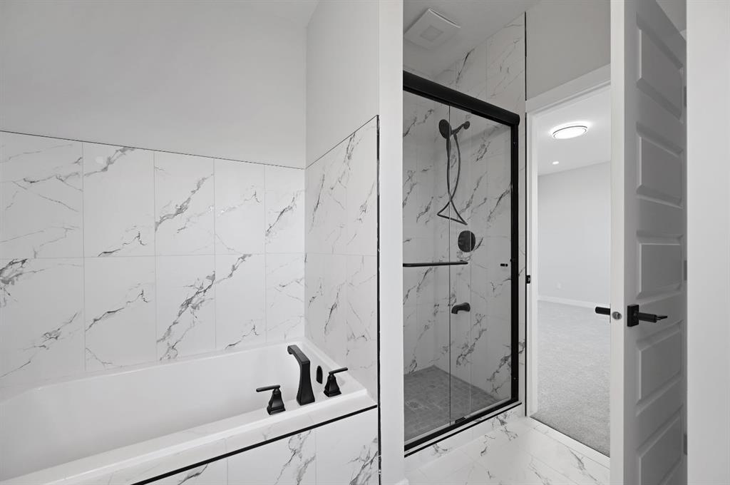 Upstairs, an extra-wide staircase leads to the spacious bonus room — ideal for movie nights or relaxing evenings — featuring another elegant white accent wall. The primary suite is a true retreat, boasting large windows, a generous walk-in closet, and a luxurious 5-piece ensuite with dual sinks, a soaker tub, and a striking white-and-black tiled shower. Two additional bedrooms offer ample space and natural light, complemented by soft, plush carpeting and a convenient upper-level laundry room.