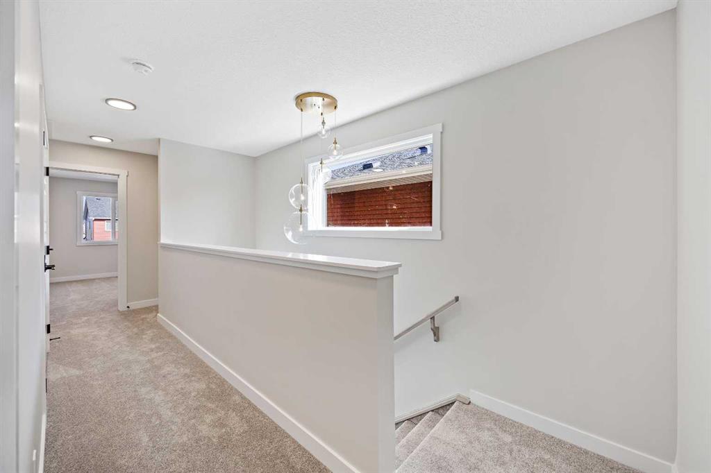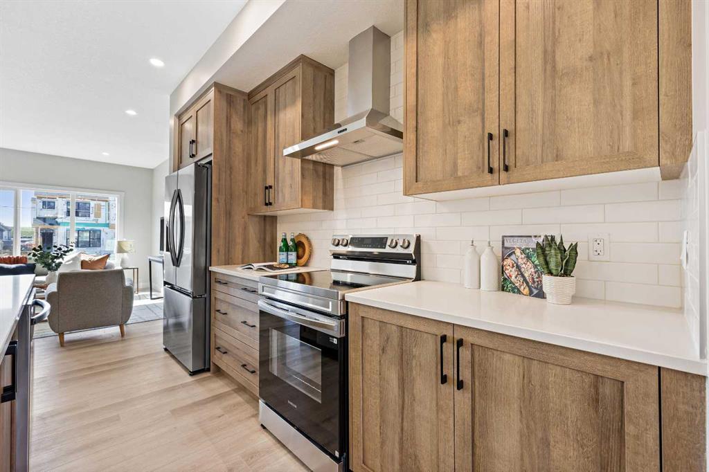 Welcome to 344 Fireside Drive in the family-friendly community of Fireside, Cochrane. This thoughtfully designed two-story duplex offers bright open-concept living and modern finishes throughout. The main floor features 9’ ceilings, luxury vinyl plank flooring, and a spacious kitchen with quartz countertops, full-height cabinetry, stainless steel appliances, a built-in microwave, and a large island with seating and ample storage. The living room is located at the front of the home with large windows that bring in natural light, creating a welcoming space for everyday living and entertaining. A half bath and stylish entryway complete this level.