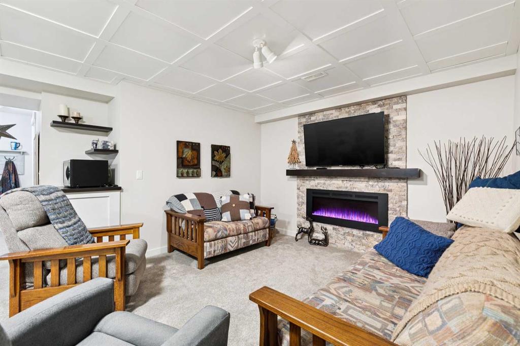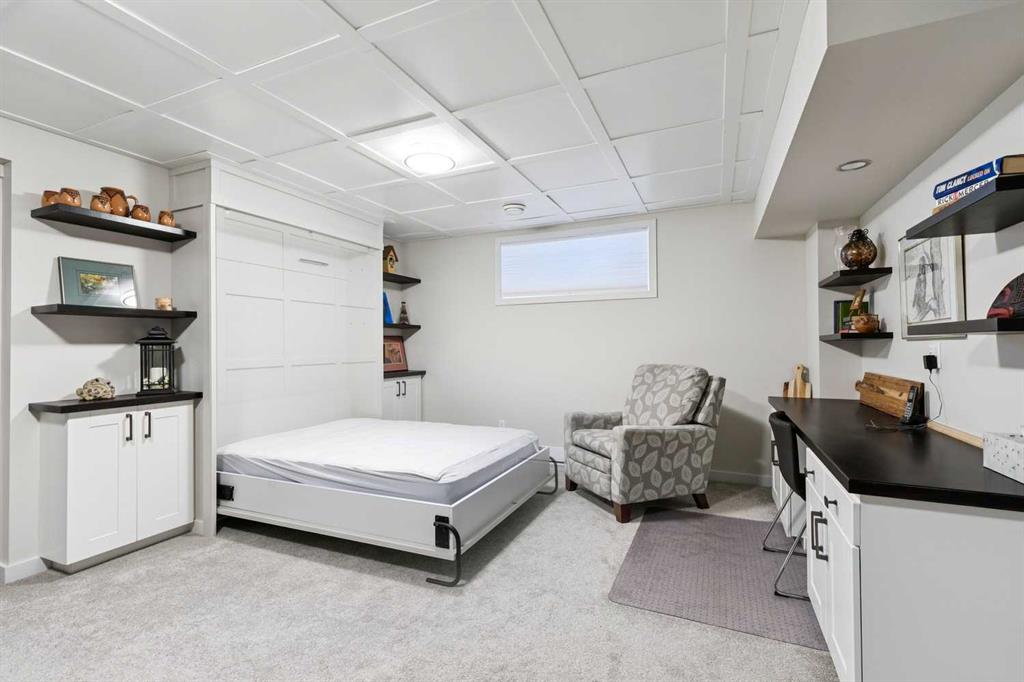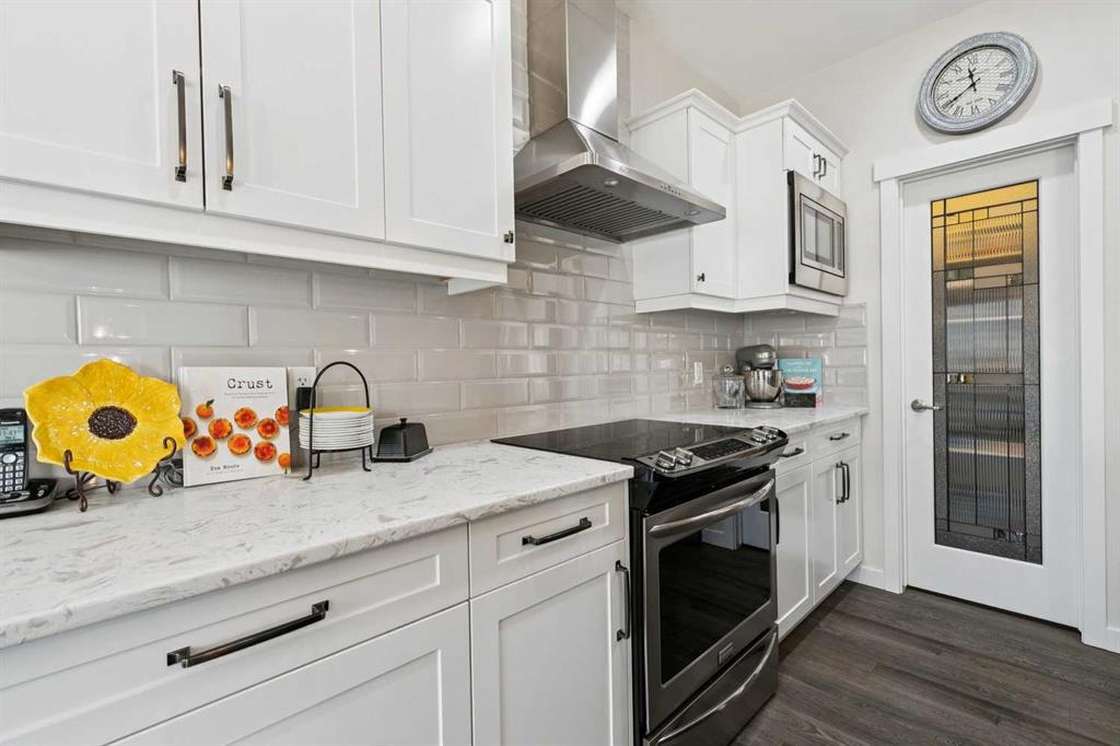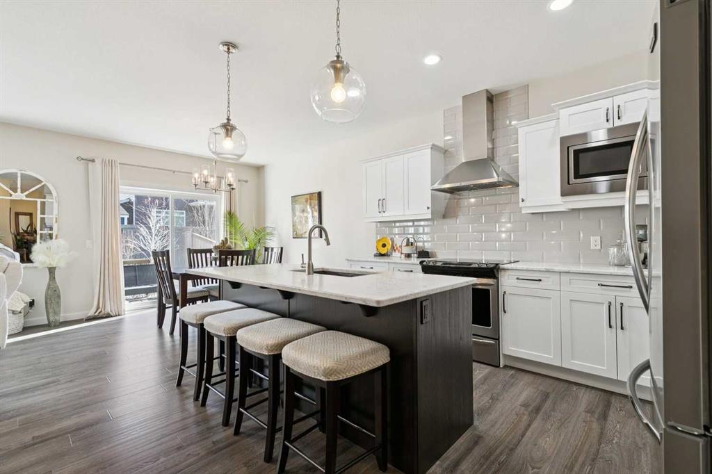 Welcome to this beautifully maintained custom-built bungalow in the family-friendly community of Ravenswood in Airdrie. Offered by the original owners, this home has been meticulously cared for and thoughtfully designed, creating a warm and comfortable space that shows pride of ownership in every detail. The spacious front entry with elegant spindle railings offers a bright and welcoming first impression. The open-concept main floor features a beautiful white kitchen with granite countertops, classic tile backsplash, stainless steel appliances, and a large corner pantry, providing both style and function. The generous island offers plenty of workspace and seating, while the dining area flows seamlessly into the large living room anchored by a cozy gas fireplace, creating an inviting place to gather with family and friends. The primary bedroom is conveniently located on the main floor and offers a relaxing retreat complete with a walk-in closet and a well-appointed ensuite featuring a soaker tub, walk-in shower, and large vanity with plenty of storage. Throughout the home you will notice thoughtful feature walls and design details that add warmth and character. The fully developed basement expands the living space beautifully, offering a large family room with a striking ceiling, electric fireplace feature wall, and built-in media area. A Murphy bed makes the space ideal for overnight guests, while the built-in desk area creates a practical workspace. Two spacious bedrooms with impressive closet space and a stylish bathroom with a tiled shower make this level perfect for family or visitors. The basement also offers excellent storage throughout, making organization easy. Outside, the beautifully landscaped backyard has clearly been lovingly maintained, featuring stunning garden beds and a charming patio area perfect for relaxing or entertaining. Additional highlights include air conditioning, new carpet, and abundant storage throughout the home. Ideally located steps from Airdrie Francophone School and Heloise Lorimer School, and only minutes to restaurants, shopping, and everyday amenities with easy access to Highway 2 for commuters. This is a rare opportunity to own a truly immaculate bungalow in a fantastic location.