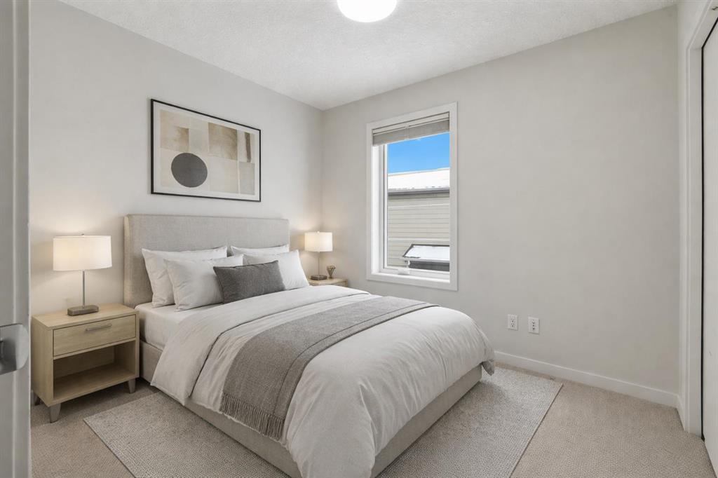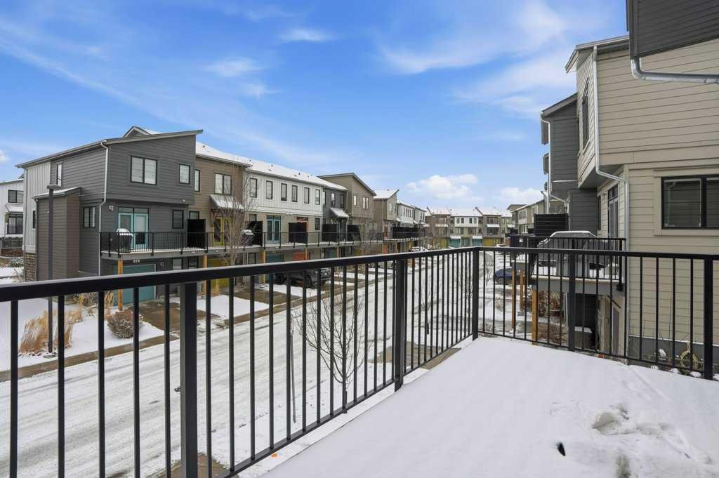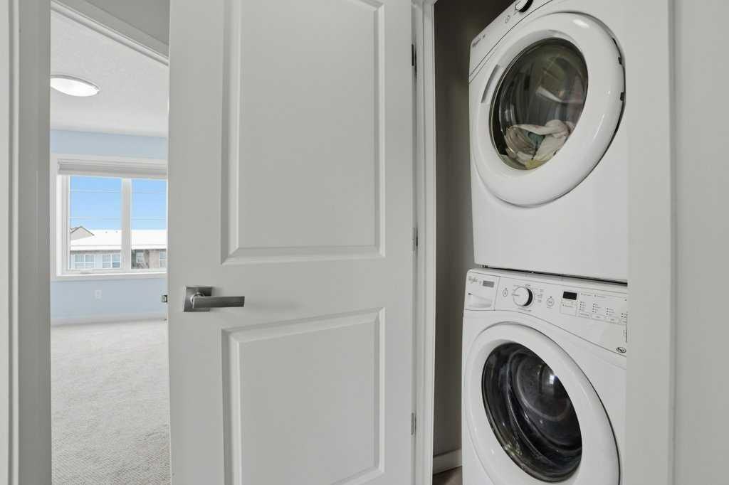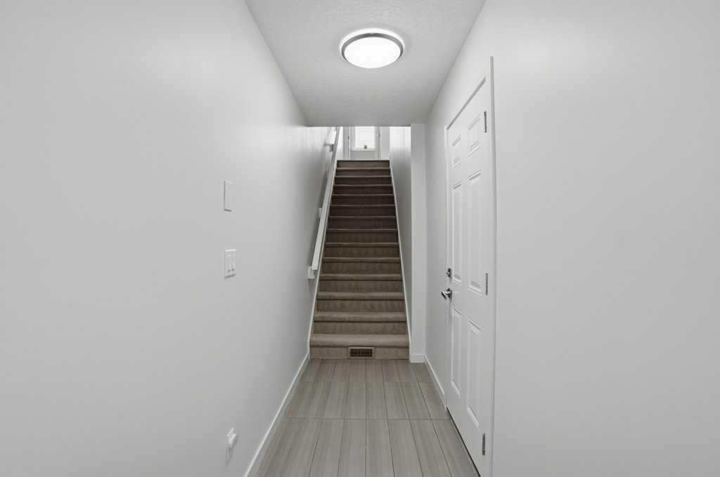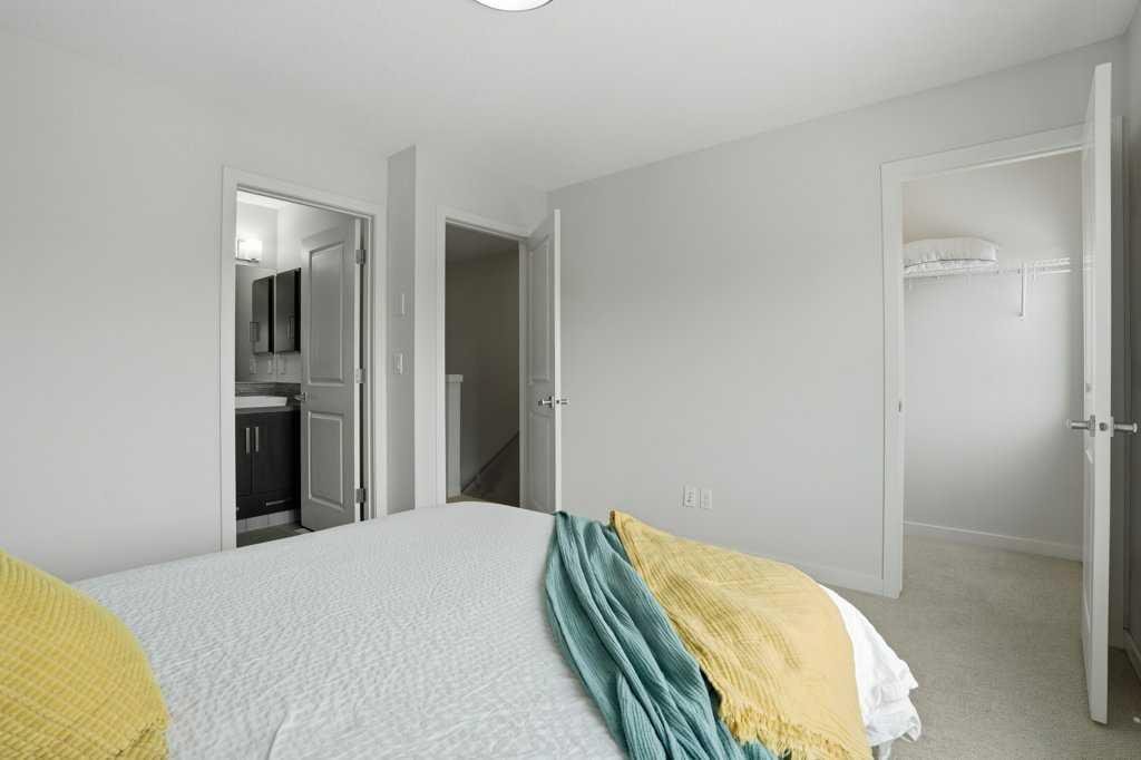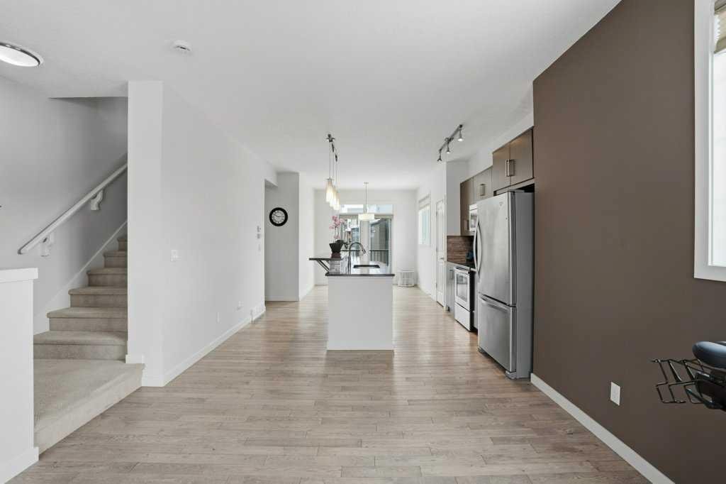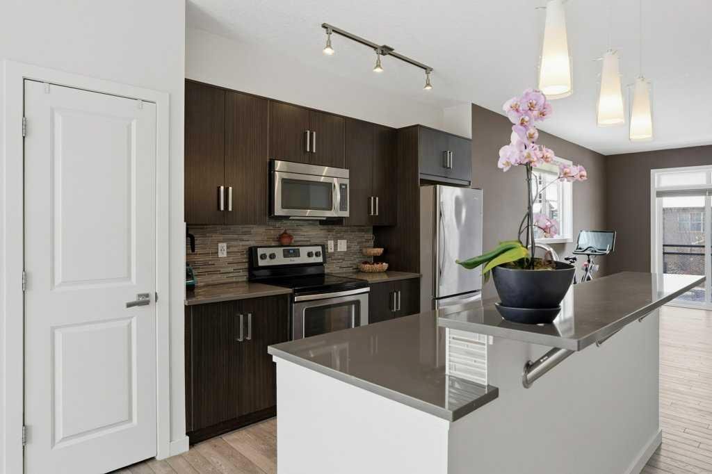 Welcome to this spacious end-unit townhouse in the desirable community of Walden, located just steps from shopping, restaurants, transit, parks, and pathways. This home features a double-attached tandem garage with a driveway, plus ample street parking nearby. Step inside to the bright main floor with hardwood flooring and custom blinds throughout. The dining area is filled with natural light from large windows and a glass door leading to your private balcony with BBQ gas line. The kitchen features stainless steel appliances, quartz countertops, and a large island with breakfast bar, perfect for entertaining. The west-facing living room is flooded with natural light, creating a warm and inviting space to relax. A convenient 2-piece bathroom completes this level. Upstairs, you’ll find three bedrooms with blackout blinds, including a primary bedroom with a walk-in closet and private ensuite. One of the secondary bedrooms also features its own walk-in closet. This level also includes a second full bathroom and convenient laundry area.The double attached tandem garage is fully finished with drywall, paint, textured ceilings, and two windows, offering excellent additional storage space. The Edison is a well-maintained complex in the heart of Walden, featuring beautifully maintained landscaping and convenient access to nearby amenities. Book your showing today!