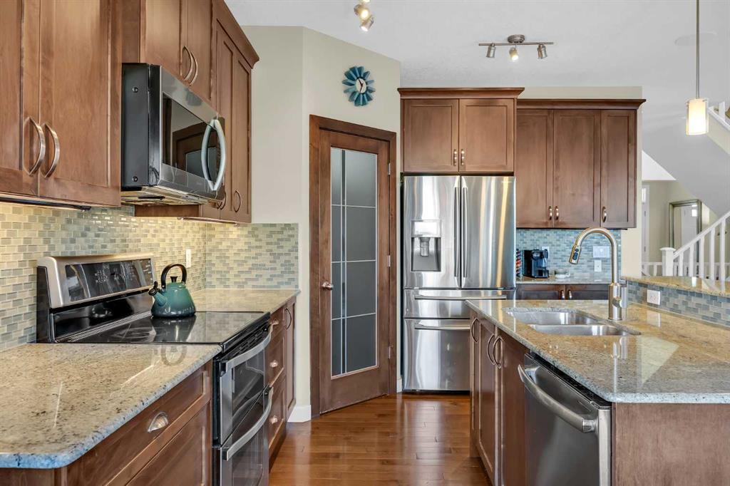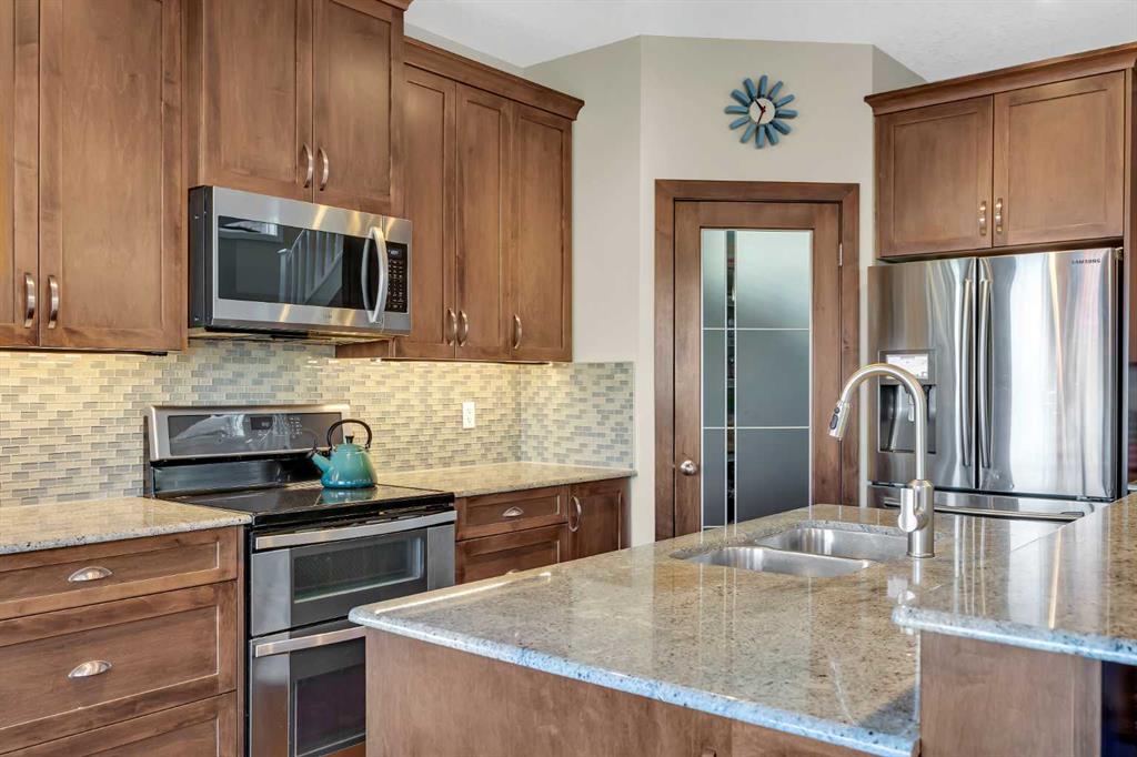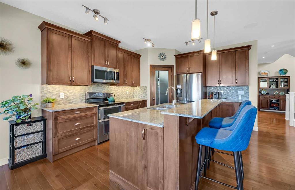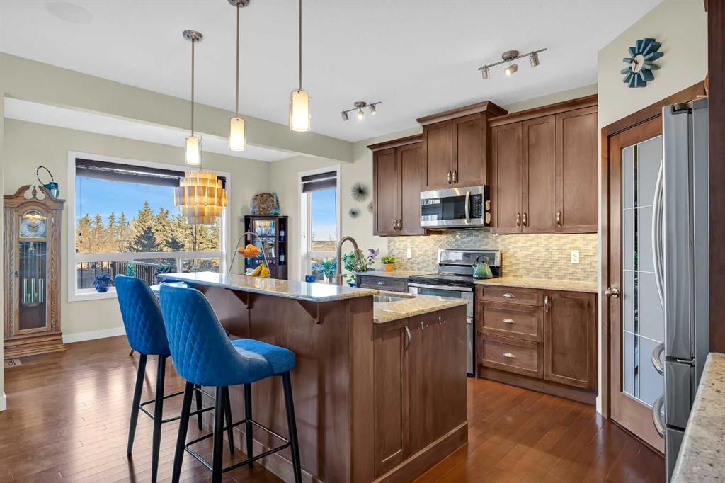 Offering a total living area of 3,396 sq. ft., the main floor showcases a bright, open-concept layout with 9’ ceilings, maple hardwood flooring, granite countertops in the kitchen and bathrooms, a cozy fireplace feature, central air conditioning, and built-in speakers. The kitchen is designed for both everyday living and entertaining, featuring a large centre island with breakfast bar, stainless steel appliances, and a convenient walk-through pantry.