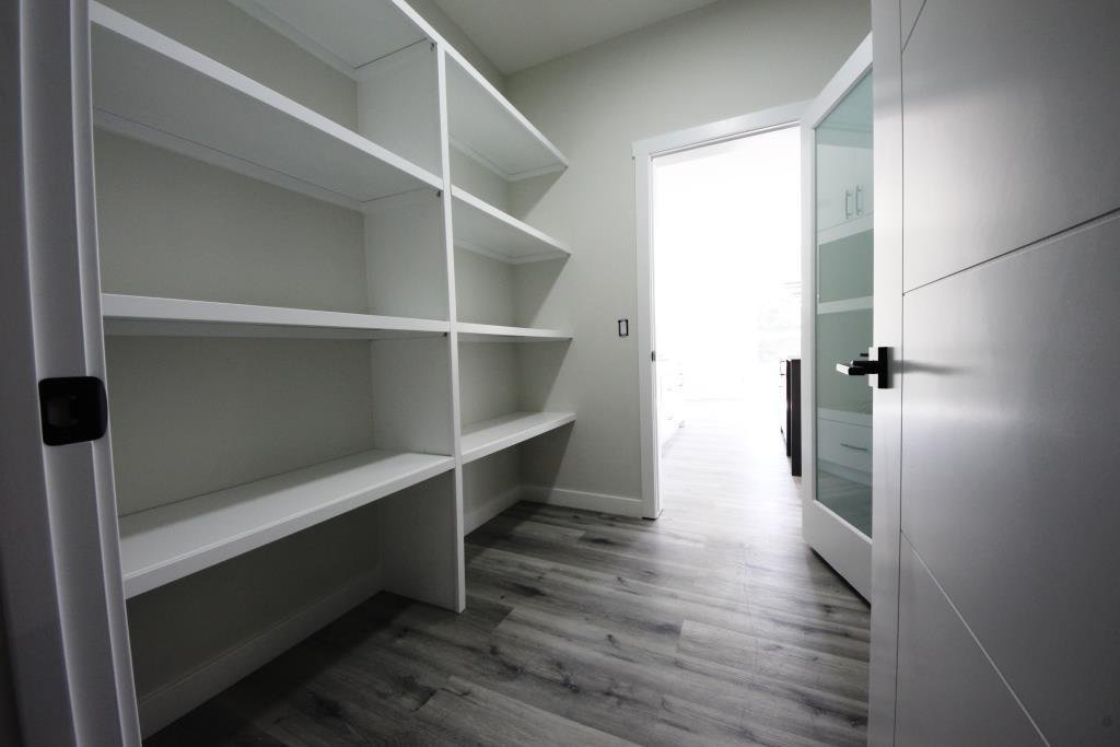 The impressive kitchen is the heart of the home, showcasing quartz countertops, tile backsplash, soft-close cabinetry, and a large central island with undermount sink and dishwasher. The walk-through butler’s pantry provides exceptional storage.