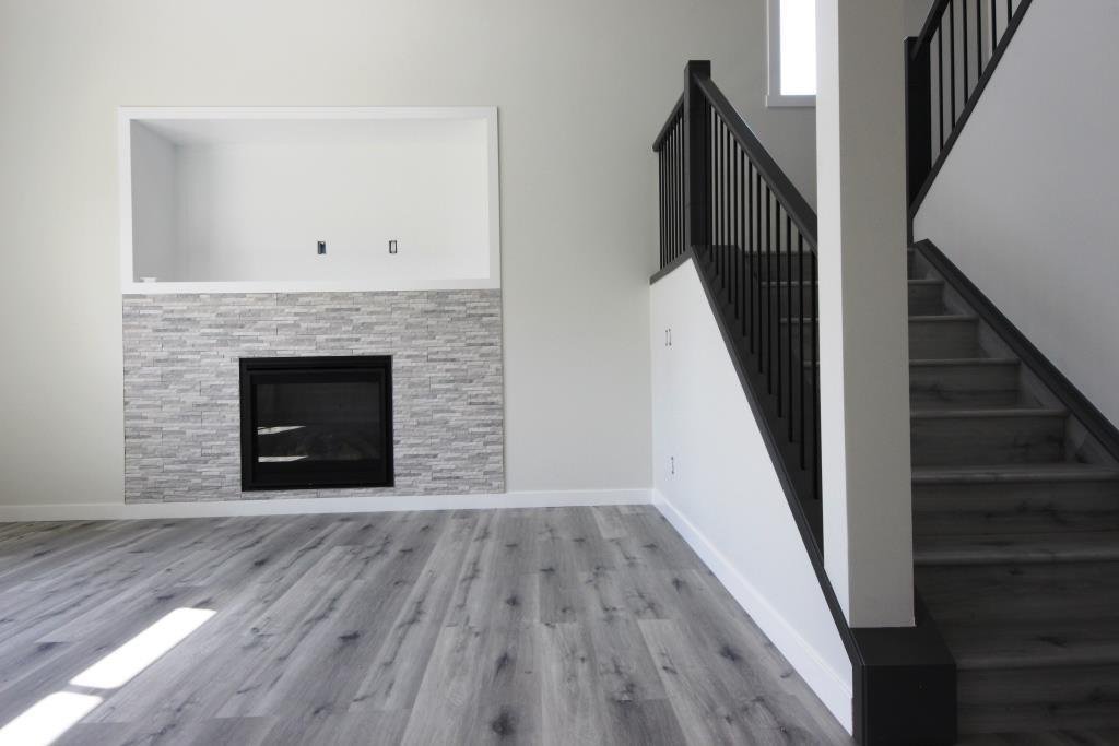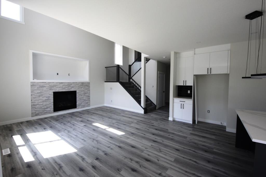 Natural light floods the main living space through triple-pane windows, offering beautiful views of the treed natural setting to the south. The living room features a stunning gas fireplace with a quartz stacked surround, creating a warm and inviting atmosphere.