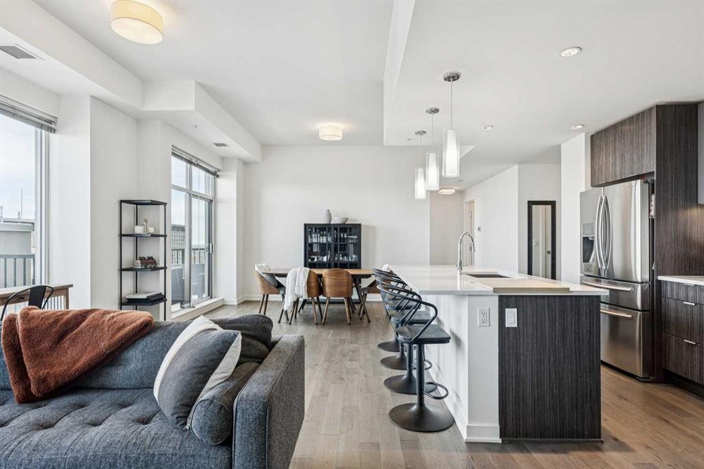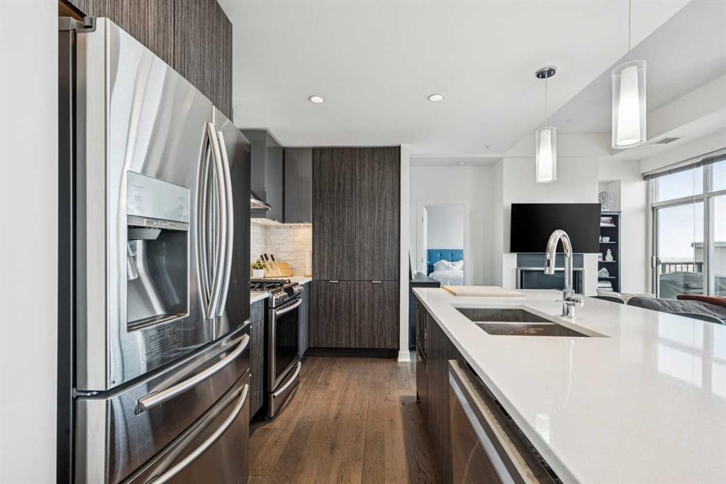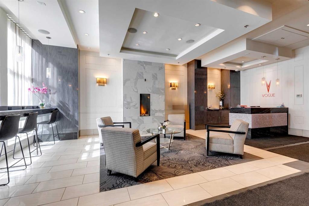 PRICE IMPROVEMENT! Experience elevated penthouse living at The Vogue, perched high above the city’s financial core. This rare 2 bedroom, 2 bathroom residence features soaring vaulted ceilings, floor-to-ceiling windows, and TWO well-placed balconies that capture sweeping urban views, river views, and natural light throughout the day. The thoughtfully designed layout includes a spacious primary retreat with a walk-in closet and an exceptional 5-piece ensuite with double vanity, a separate in-unit laundry room, and open-concept living ideal for both everyday comfort and entertaining. Offered in only a limited number of high-rise units, this penthouse delivers a truly exclusive living experience. Completing the package are TWO TITLED underground parking stalls (UNITS 1 & 2) with immediate access from the parkade entrance – a rare and valuable convenience in the downtown core.