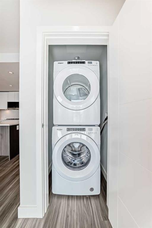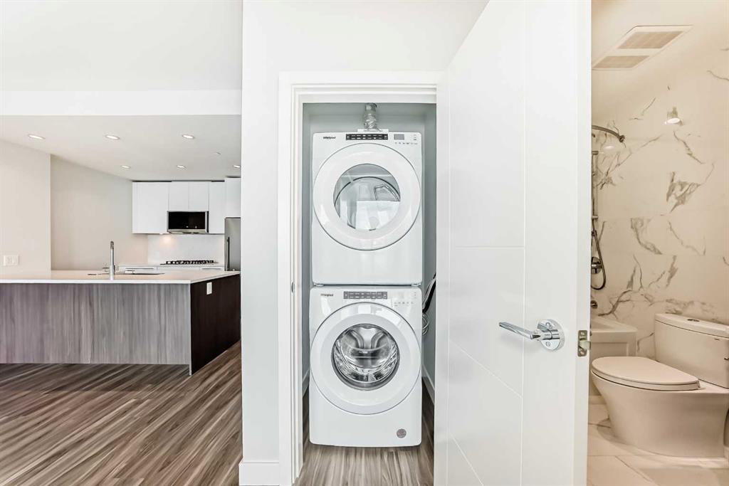 The primary bedroom has large windows and ample closet space. The well-appointed 3-piece bathroom is filled with high end finishes and a functional deep tub/shower. Additional features include full size in-suite laundry, one assigned underground parking stall (EV options available) & an assigned storage locker.