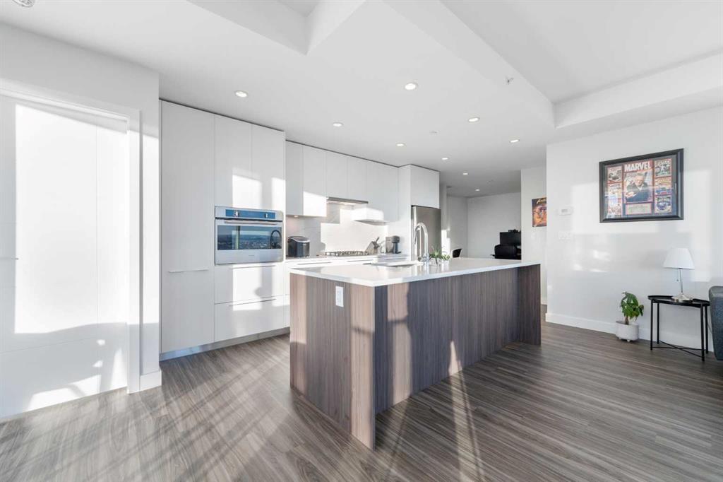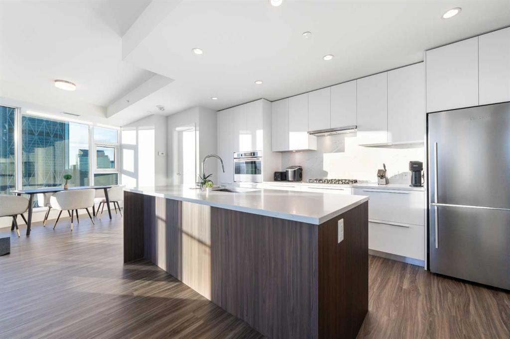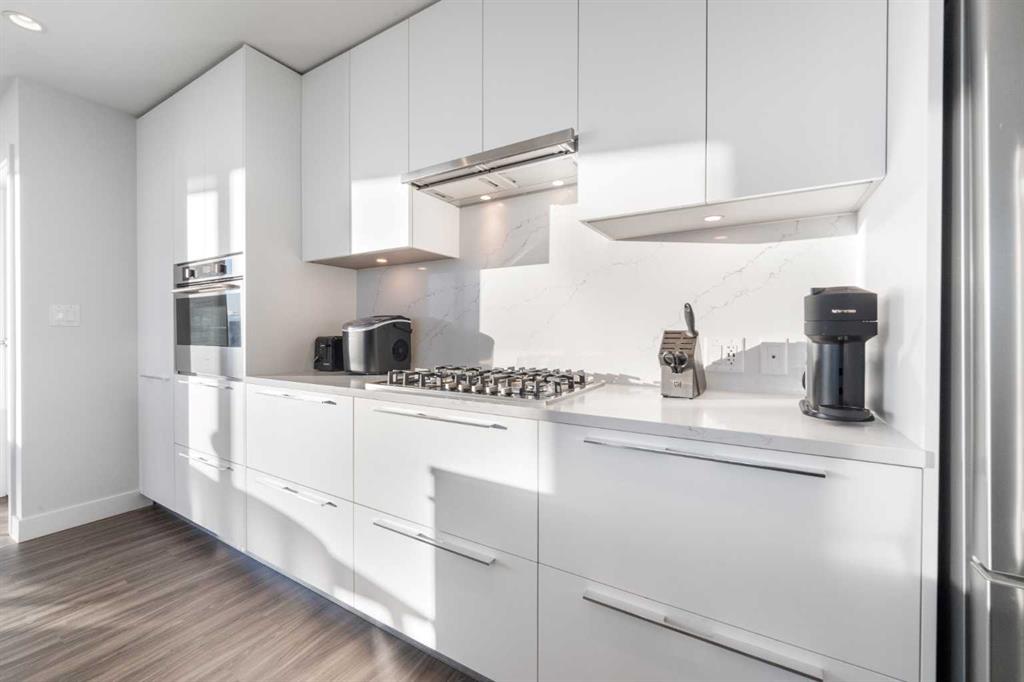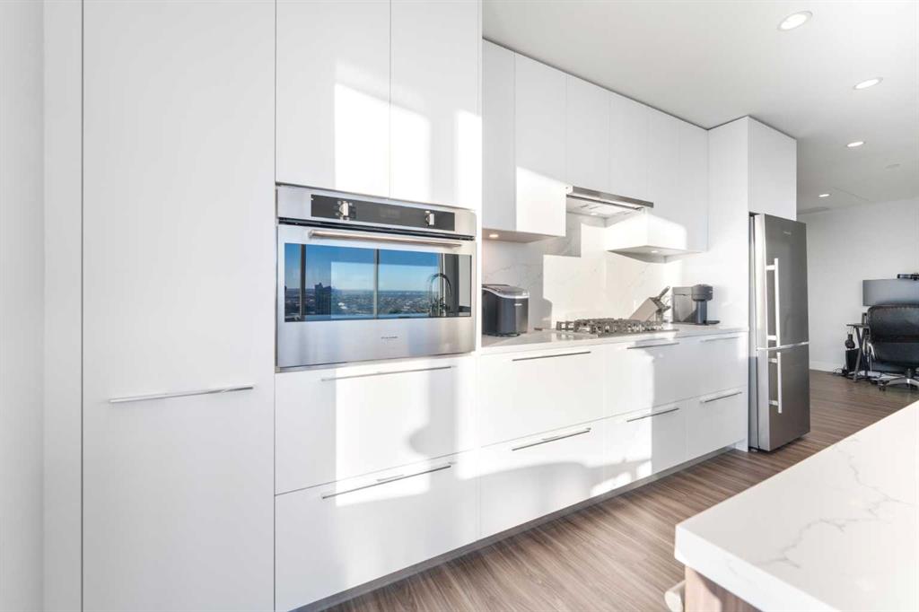 The open-concept kitchen includes a Fulgor Milano wall oven, a 5-burner gas cooktop, quartz countertops with a marble-pattern backsplash, flat-panel white cabinetry with soft-close drawers, a stainless steel refrigerator, and an integrated hood fan with a cabinet-matching cover. Luxury vinyl plank flooring runs throughout the living and dining areas. The southwest corner living space offers direct sightlines to the Calgary Tower and the Bow River.