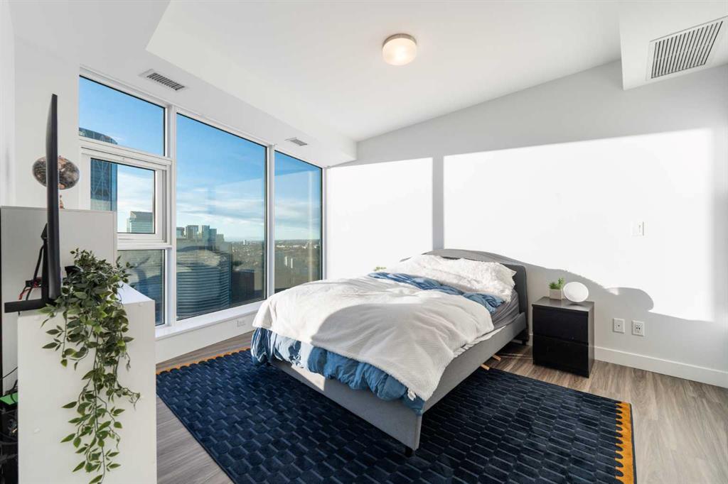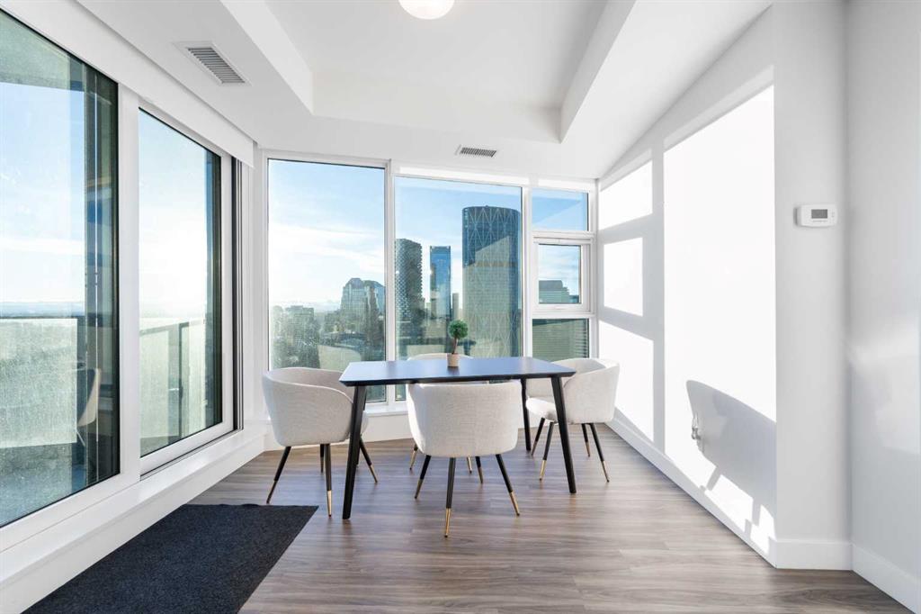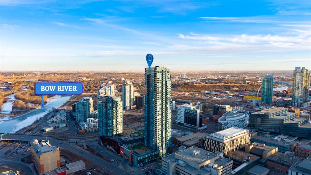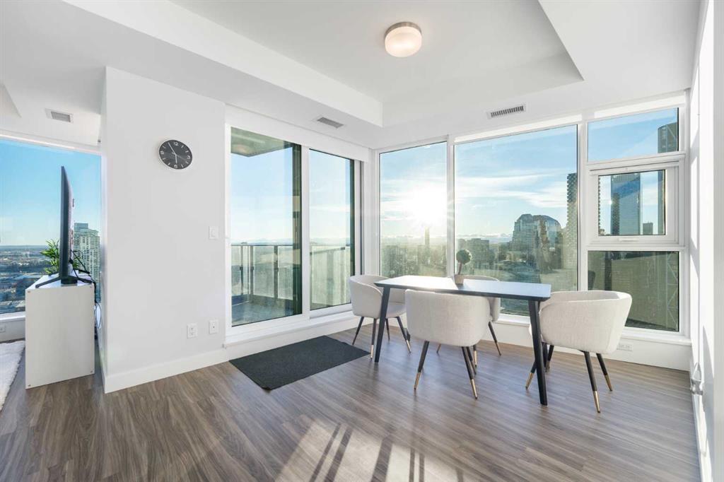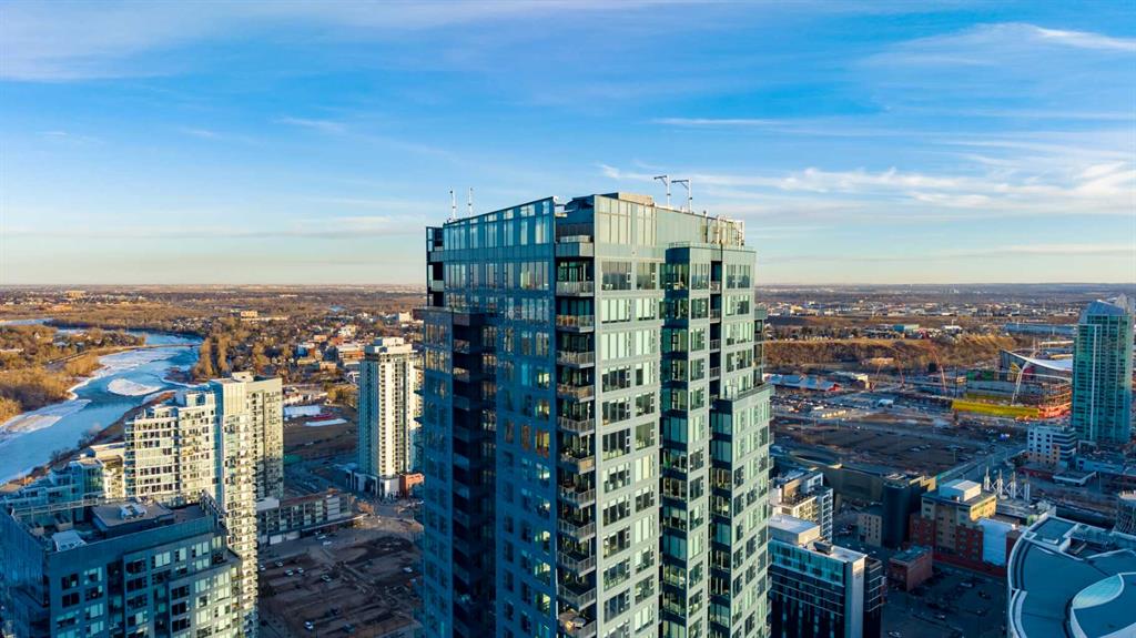 Unobstructed views of the Rocky Mountains, the Bow River, and the Calgary skyline — all from the 35th-floor southwest corner of Arris in East Village, Calgary, Alberta. This 1,150-square-foot, 2-bedroom plus den, 2-bathroom condominium features floor-to-ceiling windows on two exposures flooding the unit with natural light throughout the day.