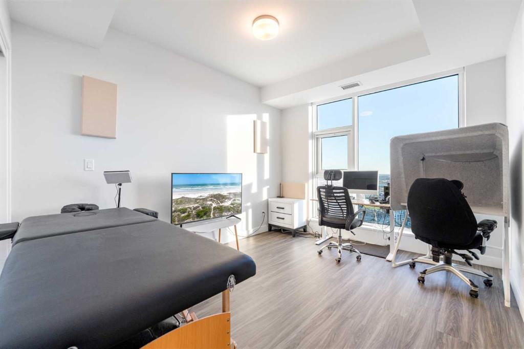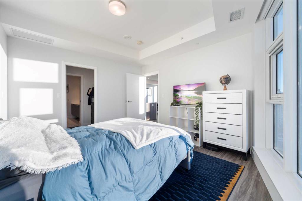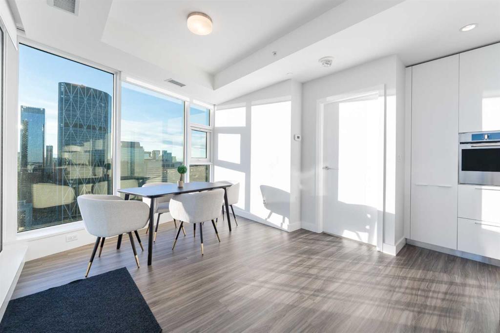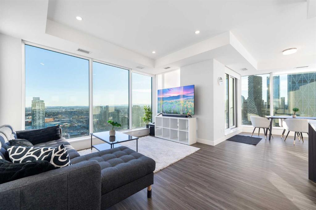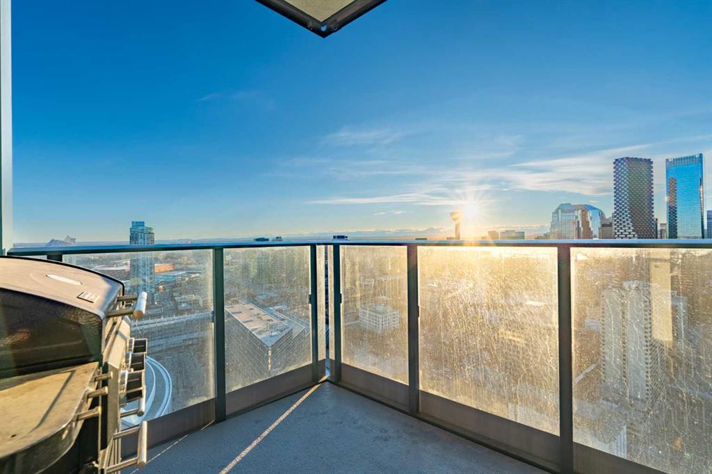 Unobstructed views of the Rocky Mountains, the Bow River, and the Calgary skyline — all from the 35th-floor southwest corner of Arris in East Village, Calgary, Alberta. This 1,150-square-foot, 2-bedroom plus den, 2-bathroom condominium features floor-to-ceiling windows on two exposures flooding the unit with natural light throughout the day.