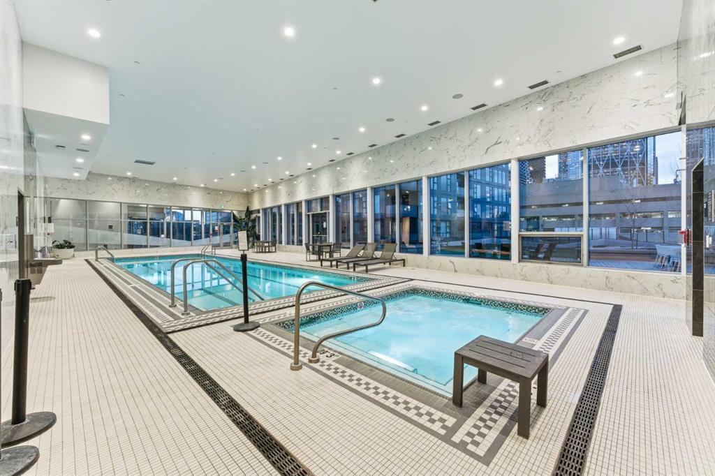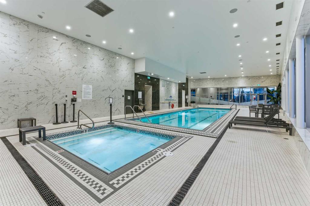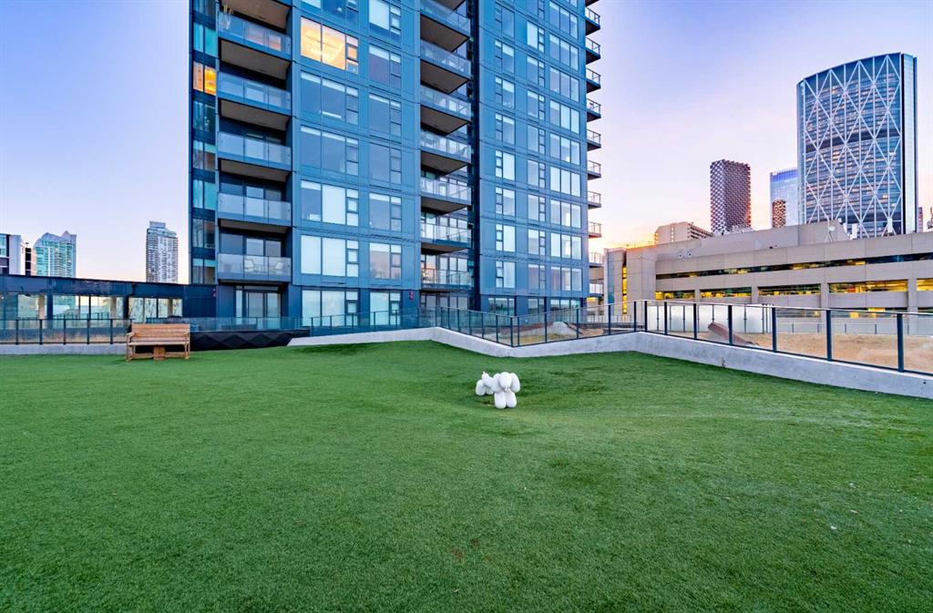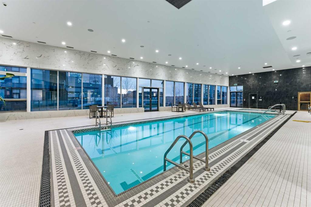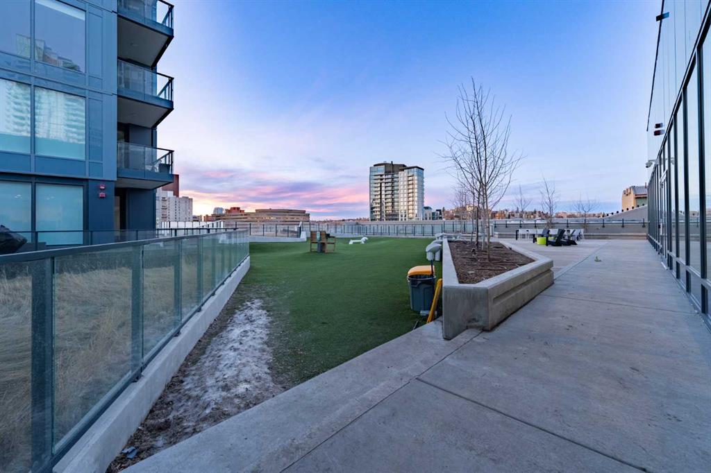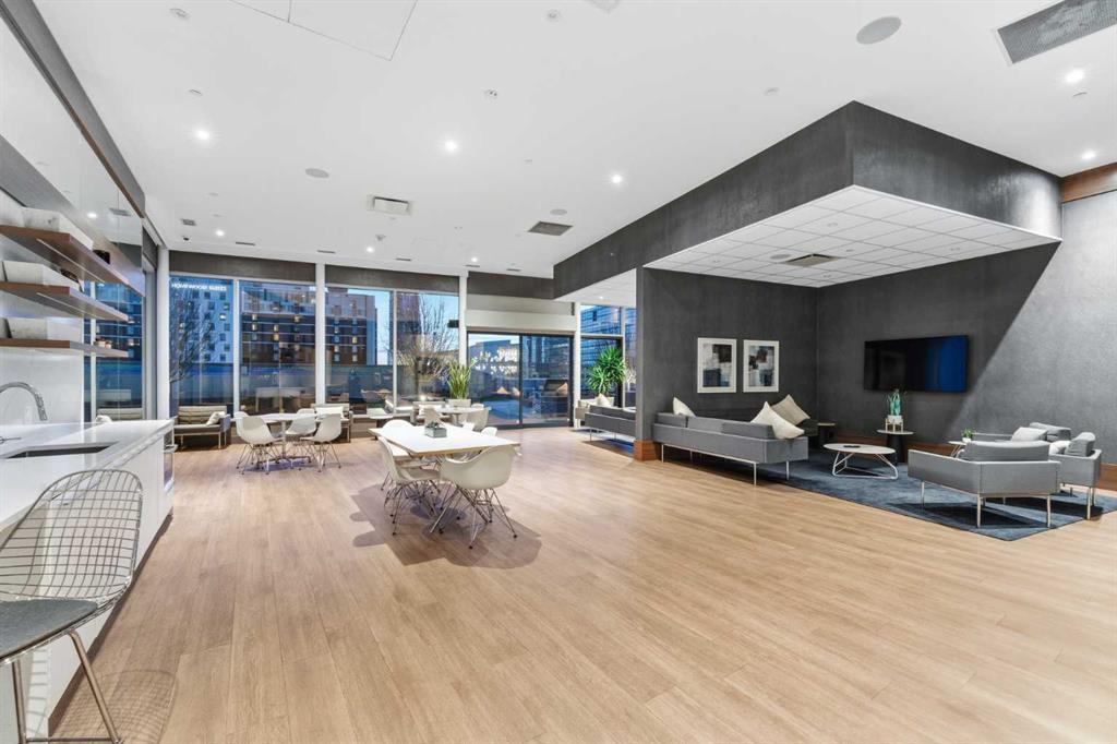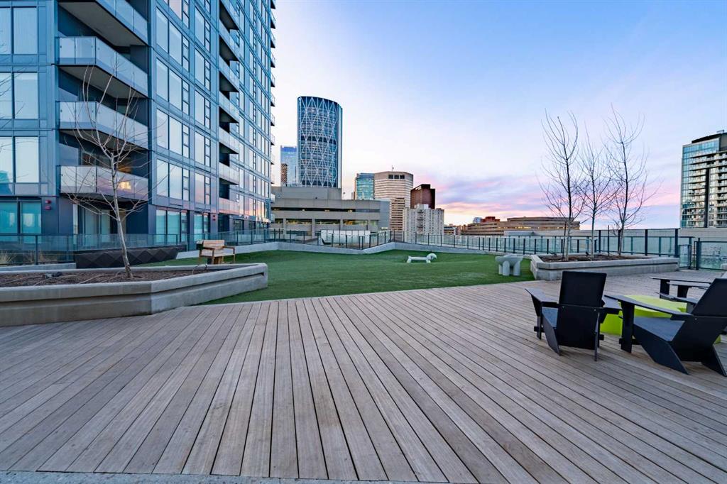 Arris offers world-class, resort-style amenities — widely regarded as the best in any Calgary condominium. The entire second floor is dedicated to resident amenities including an indoor swimming pool, hot tub, sauna, steam room, commercial-grade fitness centre with a dedicated spin and yoga studio, social lounge with bar counter and kitchenette, and a party room opening to an outdoor terrace. A rooftop turf dog park with city views and multiple outdoor gathering areas with fire features and seating complete the package.
