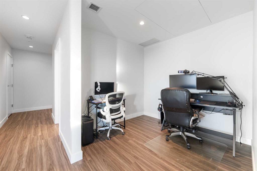 The primary bedroom accommodates a king-size bed and features a tiled ensuite bathroom. An open den off the main hallway provides dedicated home office space with room for a dual-monitor workstation. The second bedroom and second full bathroom complete the layout.
