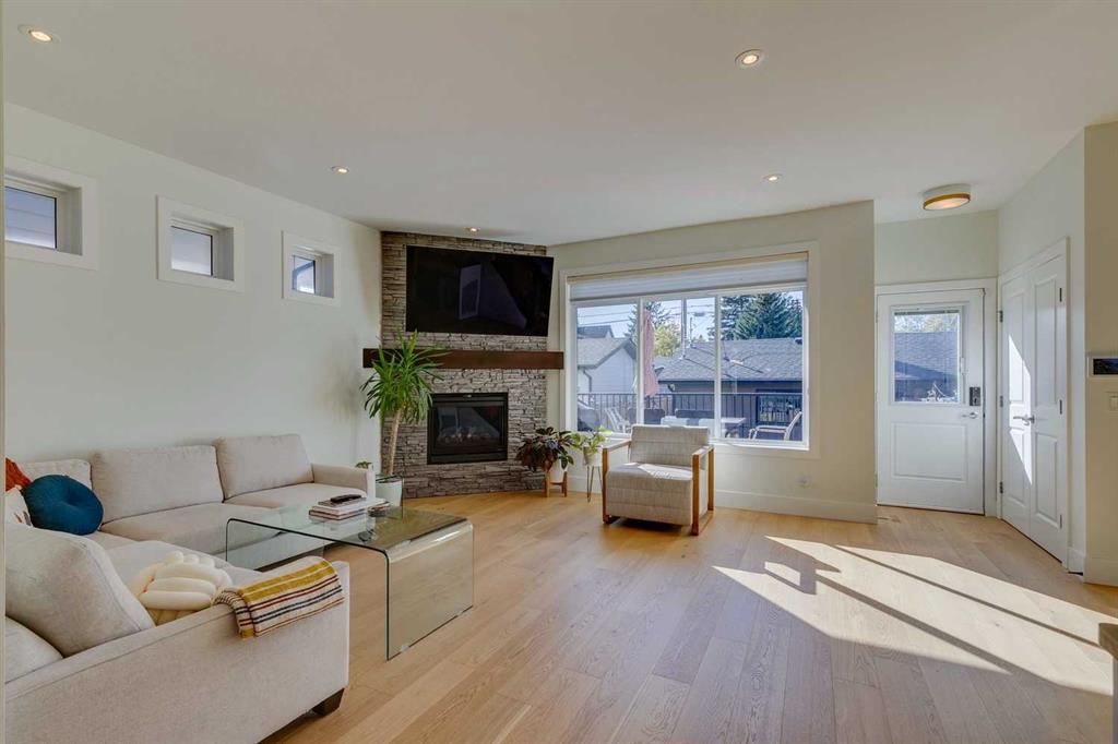 The bright and welcoming main floor features a spacious dining area with a large picture window overlooking green space and a schoolyard across the street. The gourmet kitchen is a true standout with granite countertops, gas stove, stainless steel appliances, central island, a brand-new dishwasher, and a generous walk-in pantry—perfect for cooking and entertaining. The cozy living room with a gas fireplace opens onto a sun-filled west-facing deck and a low-maintenance backyard with artificial turf, ideal for relaxing or hosting guests.