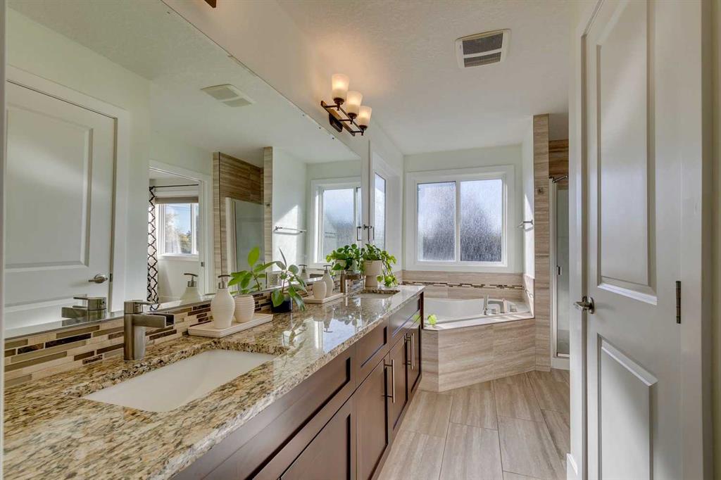 Upstairs, the west-facing primary retreat is a highlight, complete with a large walk-in closet and a spa-inspired ensuite featuring dual sinks, a soaking tub, and a separate shower. Two additional bedrooms, a full bathroom, and convenient upper-floor laundry complete this level.