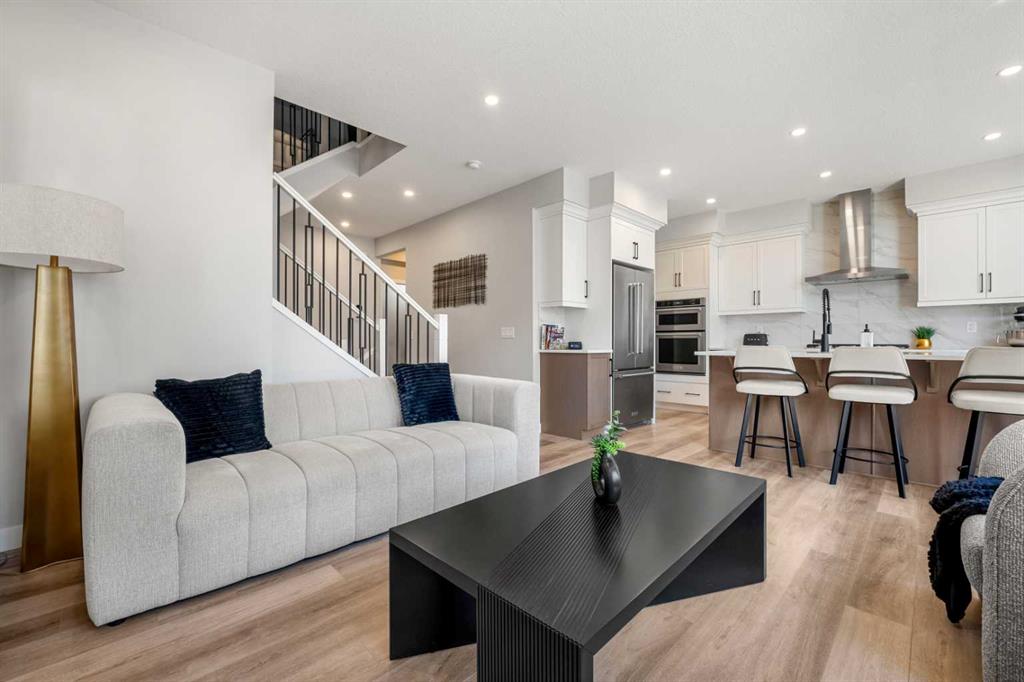 From the moment you step inside, you’ll appreciate the bright, modern design, open-concept layout, and abundance of natural light that fills the home. The main floor is both stylish and functional, featuring a spacious living area and a contemporary kitchen complete with sleek finishes, ample cabinetry, and a large island that’s ideal for meal prep and casual dining. The adjacent dining space is framed by oversized windows and highlighted by soaring ceilings, creating an inviting setting for both everyday living and entertaining.