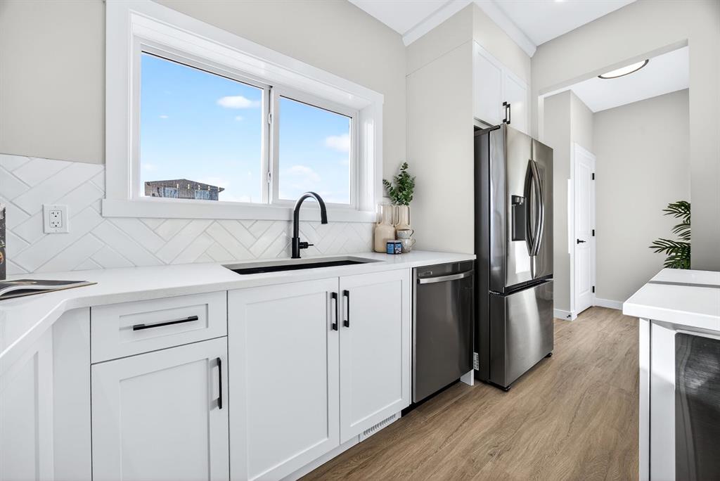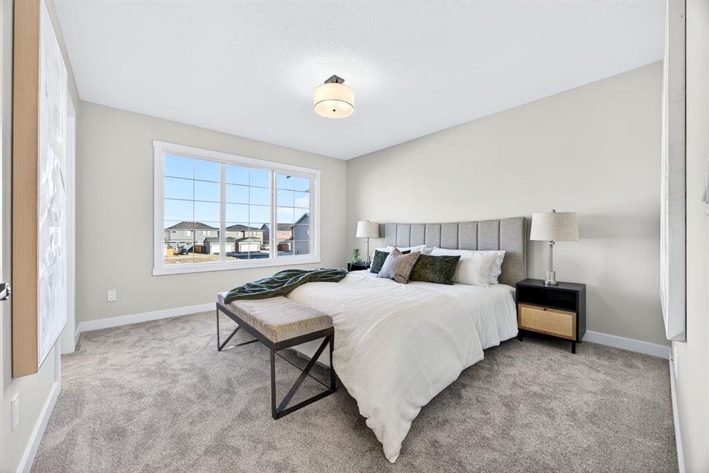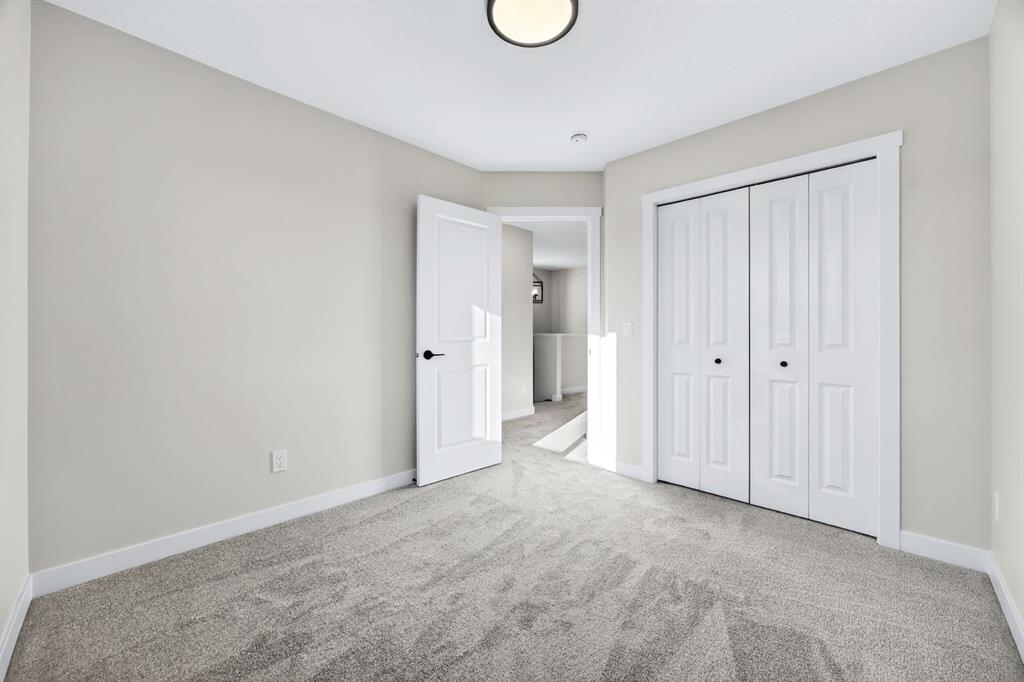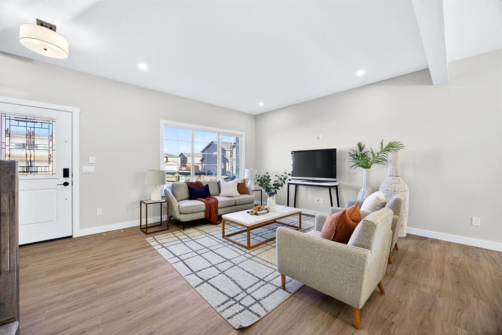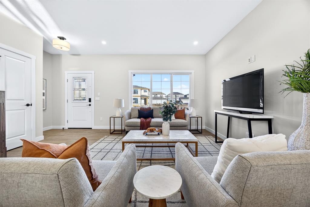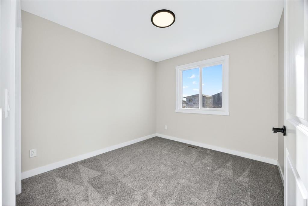 Welcome to this stunning, brand-new Genesis Builders duplex. The “Oscar” offers modern design, functional living, and exceptional future potential with basement suite rough-ins, all complemented by a warm, inviting colour palette that creates a welcoming atmosphere throughout the home. Featuring 3 bedrooms and 2.5 bathrooms, this home is thoughtfully crafted and offers over 1400 sq ft. The main floor showcases a bright, sun-filled floorplan with 9′ ceilings and a seamless open-concept layout, connecting the spacious living room, central dining area, and stylish kitchen. The kitchen is beautifully appointed with quartz countertops, two-toned cabinetry, a large central island, and a sleek stainless steel appliance package, complete with a gas line to the range. A convenient powder room completes the main level. Upstairs, the primary suite is a private retreat featuring a generous walk-in closet and a spa-inspired ensuite with his-and-hers sinks and an oversized shower. Two additional well-sized bedrooms, a full bathroom, and convenient upper-floor laundry complete the second level. The unfinished basement offers incredible flexibility with 9′ ceilings, a separate SIDE ENTRANCE, and BASEMENT SUITE ROUGH INs, making it ideal for additional living space or future income potential. Outside, the backyard is a blank canvas, ready for your personal touch and offering the opportunity to build your dream garage. Located in the vibrant and family-friendly community of Fireside, this home offers the perfect balance of small-town charm and modern convenience. Fireside is known for its extensive pathway system, parks, playgrounds, and green spaces, ideal for walking, biking, and outdoor enjoyment. Residents love the easy access to schools, shops, restaurants, and everyday amenities, all just minutes away. With quick access to Highway 22 and Highway 1, commuting to Calgary or heading west to the mountains is effortless. *Taxes have not been assessed. Photos are representative of the same model. This property’s colour palette is included in the pictures. RMS has been applied to the builder’s construction drawings.