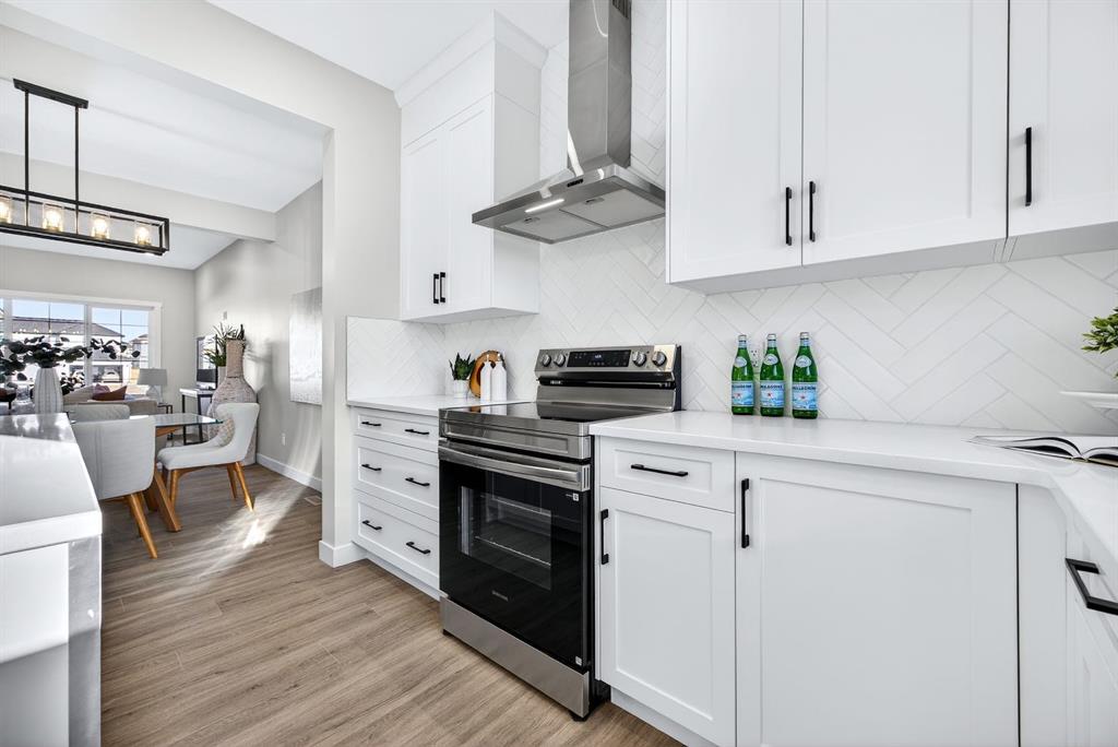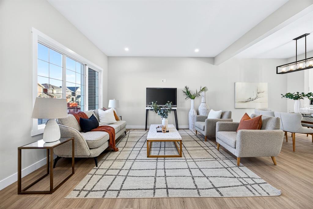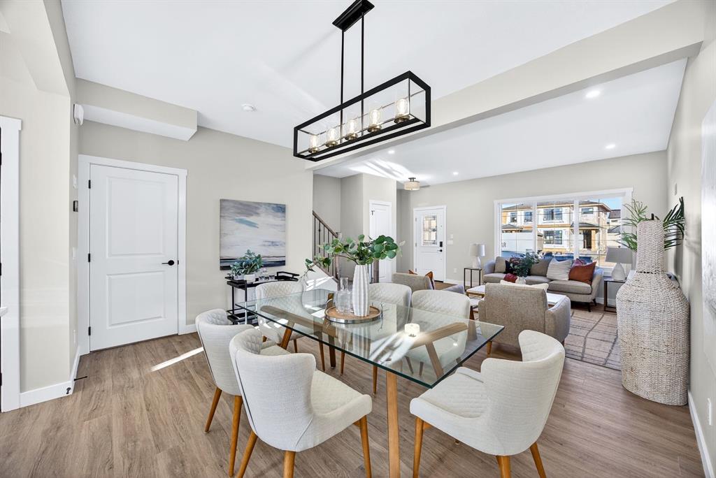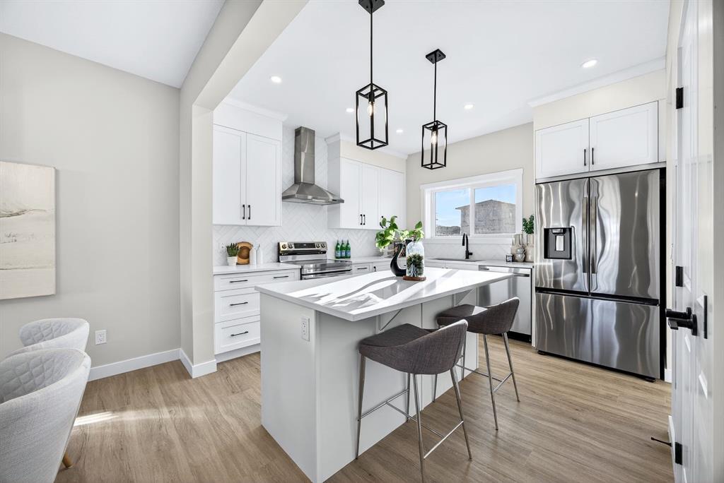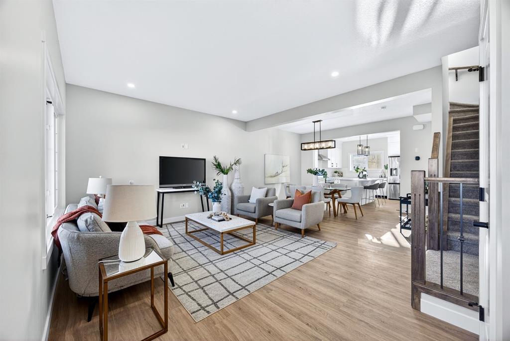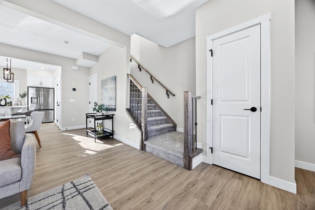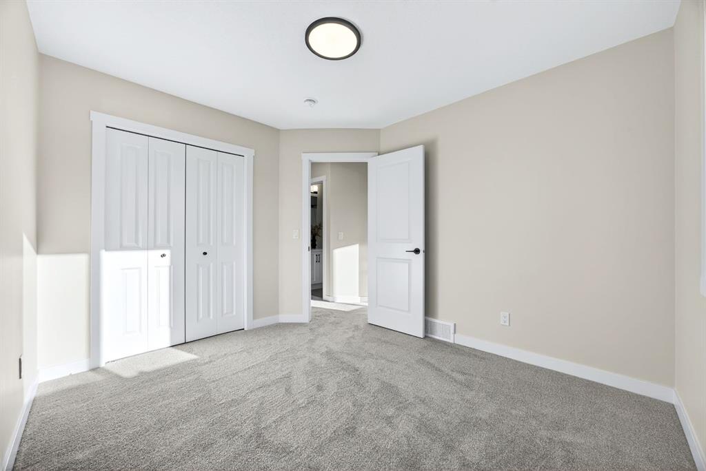 Welcome to this stunning, brand-new Genesis Builders duplex. The “Oscar” offers modern design, functional living, and exceptional future potential with basement suite rough-ins, all complemented by a warm, inviting colour palette that creates a welcoming atmosphere throughout the home. Featuring 3 bedrooms and 2.5 bathrooms, this home is thoughtfully crafted and offers over 1400 sq ft. The main floor showcases a bright, sun-filled floorplan with 9′ ceilings and a seamless open-concept layout, connecting the spacious living room, central dining area, and stylish kitchen. The kitchen is beautifully appointed with quartz countertops, two-toned cabinetry, a large central island, and a sleek stainless steel appliance package, complete with a gas line to the range. A convenient powder room completes the main level. Upstairs, the primary suite is a private retreat featuring a generous walk-in closet and a spa-inspired ensuite with his-and-hers sinks and an oversized shower. Two additional well-sized bedrooms, a full bathroom, and convenient upper-floor laundry complete the second level. The unfinished basement offers incredible flexibility with 9′ ceilings, a separate SIDE ENTRANCE, and BASEMENT SUITE ROUGH INs, making it ideal for additional living space or future income potential. Outside, the backyard is a blank canvas, ready for your personal touch and offering the opportunity to build your dream garage. Located in the vibrant and family-friendly community of Fireside, this home offers the perfect balance of small-town charm and modern convenience. Fireside is known for its extensive pathway system, parks, playgrounds, and green spaces, ideal for walking, biking, and outdoor enjoyment. Residents love the easy access to schools, shops, restaurants, and everyday amenities, all just minutes away. With quick access to Highway 22 and Highway 1, commuting to Calgary or heading west to the mountains is effortless. *Taxes have not been assessed. Photos are representative of the same model. This property’s colour palette is included in the pictures. RMS has been applied to the builder’s construction drawings.