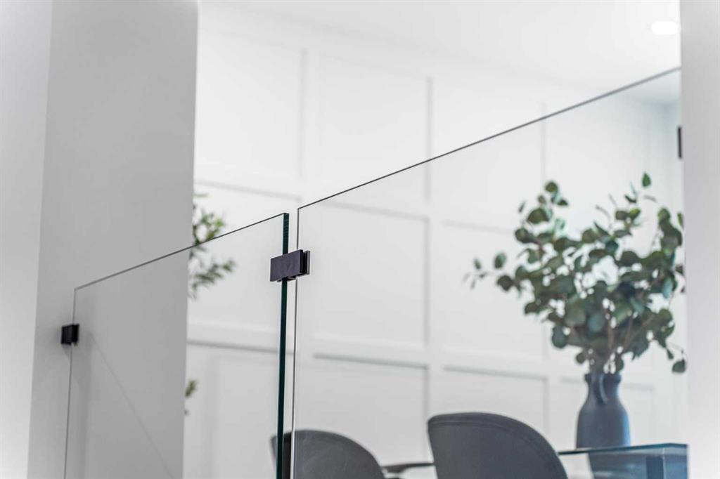 The living room features sleek glass railings, soaring ceilings and a cozy gas fireplace anchoring the room. Off the living room, step out onto the rear deck overlooking a peaceful greenspace—a private, calming backdrop that’s perfect for morning coffee or unwinding after a long day.