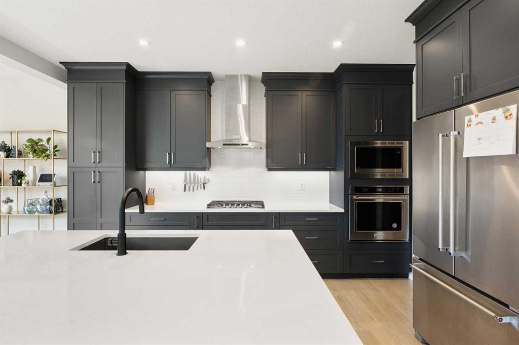 Step inside and be greeted by 9-foot ceilings and stylish vinyl plank flooring throughout the main level. The bright East-facing Living room with electric fireplace creates a warm, inviting atmosphere flooded with natural light. The modern gourmet Kitchen boasts quartz countertops, full-height cabinetry with soft-close features, stainless steel appliances including built-in gas cooktop, wall oven, and microwave, a breakfast bar from the centre island, and a walk-through pantry for ample storage. The adjacent Dining room provides the perfect space for family meals and entertaining. A Mudroom with built-in bench and coat hooks adds everyday convenience, and a powder room completes the main level. Custom exterior gemstone lighting adds sophisticated curb appeal and can be controlled via smartphone.