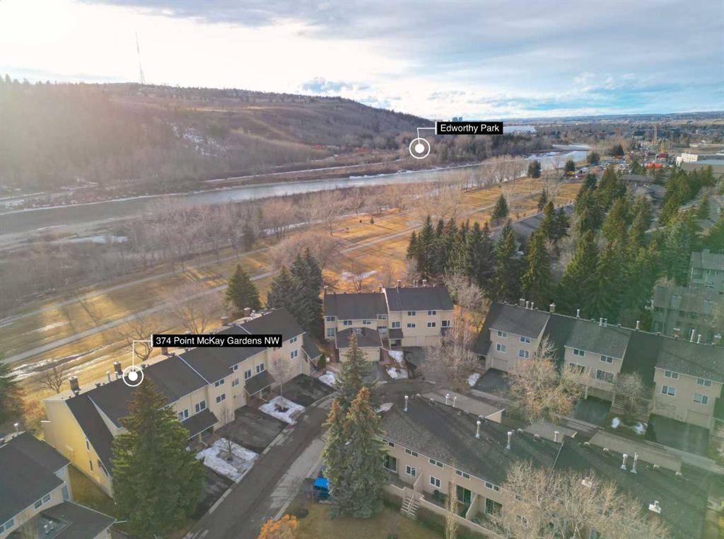 A rare riverfront find! In pristine condition, with intelligent upgrades and original character elements throughout; this beautiful Point McKay townhome presents a rare opportunity to own one of the properties that put this area among Calgary’s most coveted communities. A covered front porch gives way to a large foyer with sizable closets, shared with the single attached garage entry. Light filters down, inviting you to step up into a stunning living area with soaring ceilings and full-height windows showcasing panoramic riverside scenery. The brick hearth from the original wood-burning fireplace extends all the way up as well, a gorgeous focal point in the light and airy room, while sliding glass doors segue into outdoor living. Wall cutouts and open railings connect the four-level split layout and the amazing views as you move up into the dining room. Noticeable updates in the kitchen include lighting and some appliances, and the windows in the home are newer as well. Oak cabinetry is timeless – you could easily refresh the look of the entire space with a flooring or countertop change. The breakfast nook enjoys morning sun, perfect for a cup of coffee before you start the day. A half bath on this level is convenient and cute as-is, or you might choose to infuse your personal taste with a simple remodel. Upstairs, you will notice a similar theme. Every inch of this home is immaculate, with neutral finishes that will work with any décor, or bring in your own aesthetic to make it truly your own. Spacious and bright, the primary bedroom includes a walk-through closet, and a four-piece ensuite with a vintage alcove shower has a unique charm. Two more bedrooms provide plenty of space for guests, a family, or offices. A well-appointed main bath completes this level. In the basement, you will find a laundry area as well as a huge utility room with tons of extra storage space. Outside, the brick patio feels like a private oasis, looking over the green space and river shoreline. Garden beds thrive in the sunny exposure, and amazing sunsets paint the perfect backdrop for evening gatherings. This area is picturesque and parklike, with the Bow River Pathway just steps from your door offering hours of activities, whether you walk, run, or visit nearby outdoor fitness parks and off leash areas. Cycle commuters can be downtown in close to the same time as the short trip takes by car. This community attracts active professionals, and the neighbourhood is well-resourced, with the Riverside Club providing fitness and wellness facilities and the iconic Riverside Spa. Foothills and the Children’s hospitals are both nearby, as is the University of Calgary. Local residents enjoy several hidden gem restaurants, like the Lazy Loaf and Kettle, Nove Nine Diner, and LICS Ice Cream. A short drive (or bike ride) puts one of Calgary’s hottest food districts in easy reach, or you can be headed west into the mountains with only a few minutes’ drive in the other direction. See this one today!