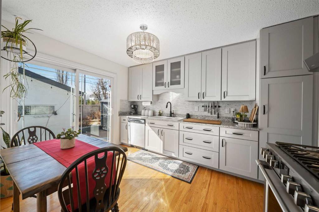 The sun-filled, south-facing kitchen opens through patio doors to a private backyard retreat. Thoughtfully updated in 2014, the kitchen features classic cabinetry, luxurious granite countertops, upgraded appliances, and a gas stove—perfect for everyday living and entertaining.