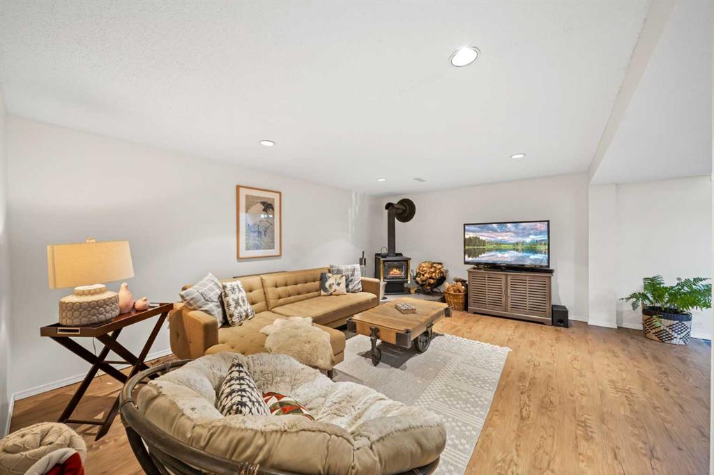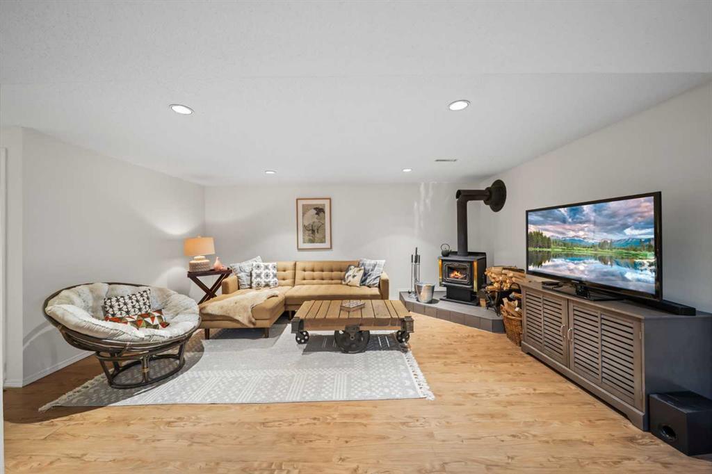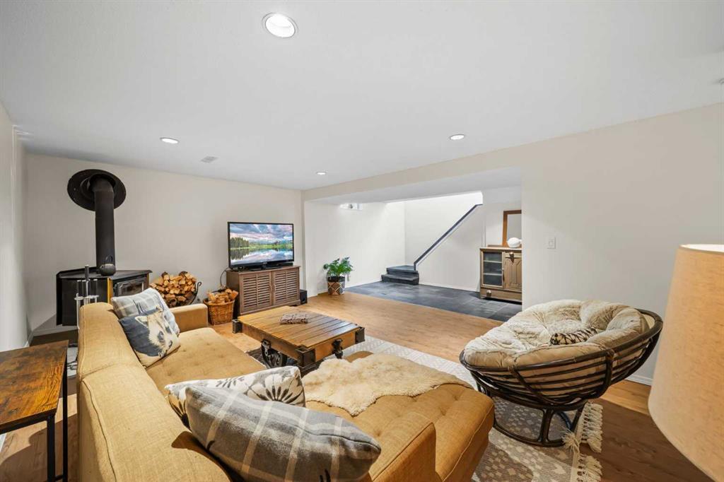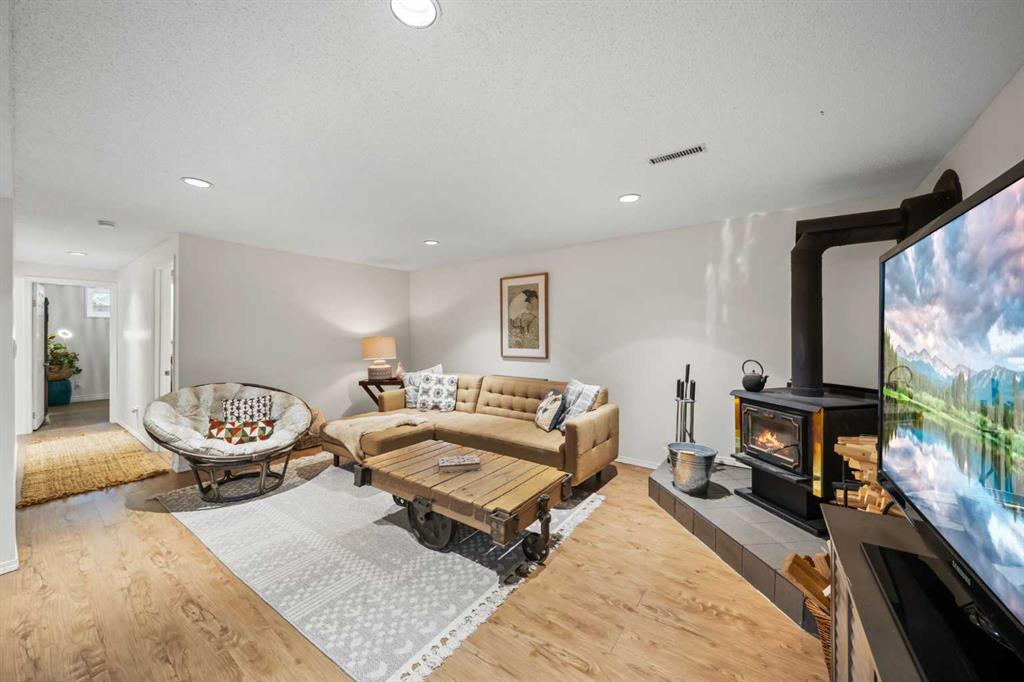 A separate side entrance provides access to both levels, offering excellent potential for an additional living space within the current functional layout. The fully finished basement includes 2 bedrooms, a 3-piece bathroom, a versatile flex room, and a large family room complete with a cozy wood-burning stove—ideal for relaxing or movie nights with family & friends.