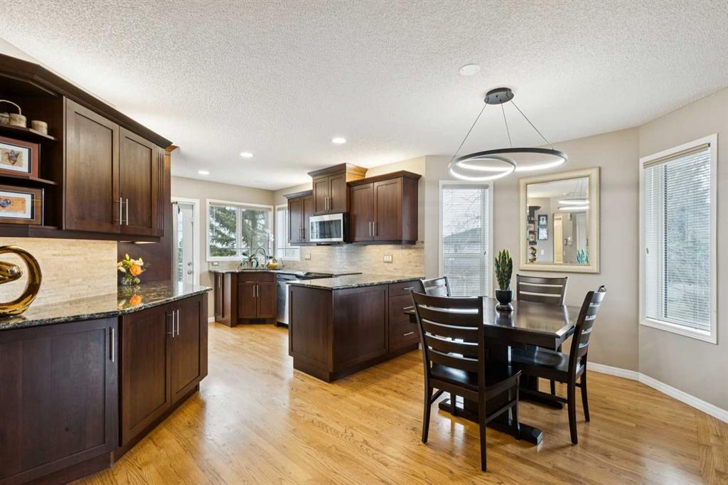 OPEN HOUSE Saturday April 25 from 1-3 pm. Well-maintained Jayman-built bungalow offering a functional layout and quality updates throughout. The main floor features oak hardwood flooring and a kitchen updated with new cabinets, stainless appliances, and granite counters in 2011, along with a convenient main floor laundry. There are two bedrooms up, including a primary bedroom with a 3-piece ensuite. A three-sided fireplace adds warmth and character to the main living space, and a phantom screen provides added comfort and airflow. The fully developed walkout basement includes a third bedroom, a 4-piece bathroom, plush carpet, and a spacious recreation area with a wet bar and a large built-in entertainment center. A gas fireplace on a thermostat adds comfort to the lower level. Additional features include air conditioning, a furnace replaced approximately 3 years ago, and a hot water tank installed in 2017. The private, landscaped backyard includes a shed and offers a quiet outdoor space to enjoy. A solid bungalow with practical upgrades and flexible living areas.
