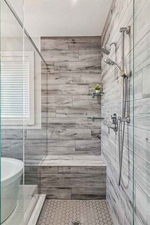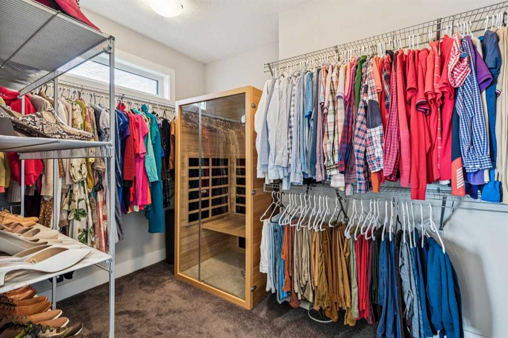 Upstairs, the primary bedroom includes vaulted ceilings and an ensuite with heated floors, soaker tub, glass shower, and walk-in closet with private sauna.