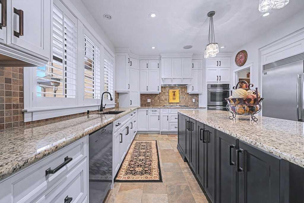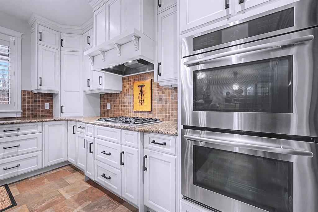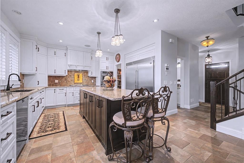 The heart of the home is the gourmet kitchen—a dream for both chefs and entertainers. Outfitted with built-in stainless steel appliances including a Frigidaire Professional dual-door fridge, JENN-AIR gas cooktop & oven, and MIELE dishwasher, this kitchen blends functionality and beauty. A massive island, granite countertops, and warm wood shaker cabinets elevate the space, while the massive walk-in pantry ensures everything has a place.