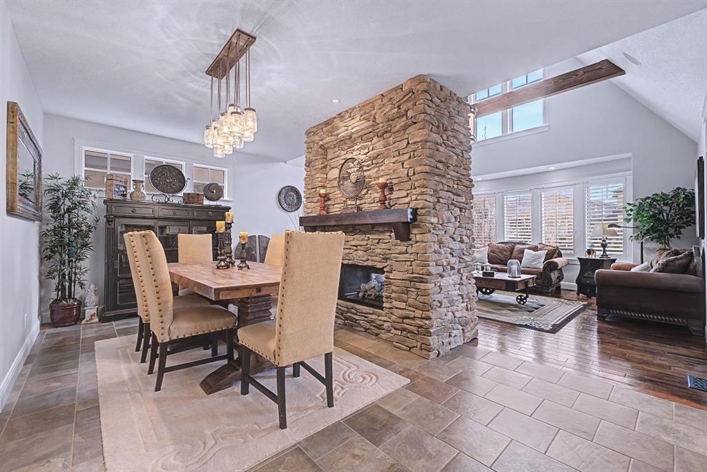 The open-concept main level features sky-high vaulted ceilings, with an 18 ft dual-sided stone fireplace that warms both the dining area and the inviting living room, drenched in natural light from oversized windows. The entire main level has been freshly painted in a warm white, enhancing the home’s airy and inviting feel..