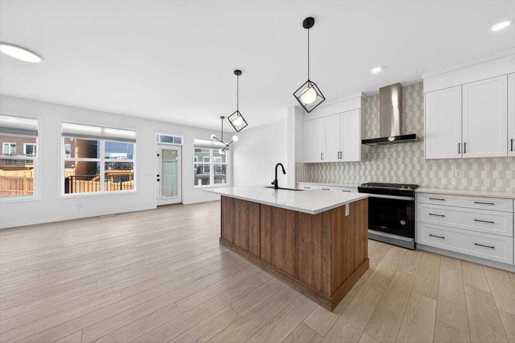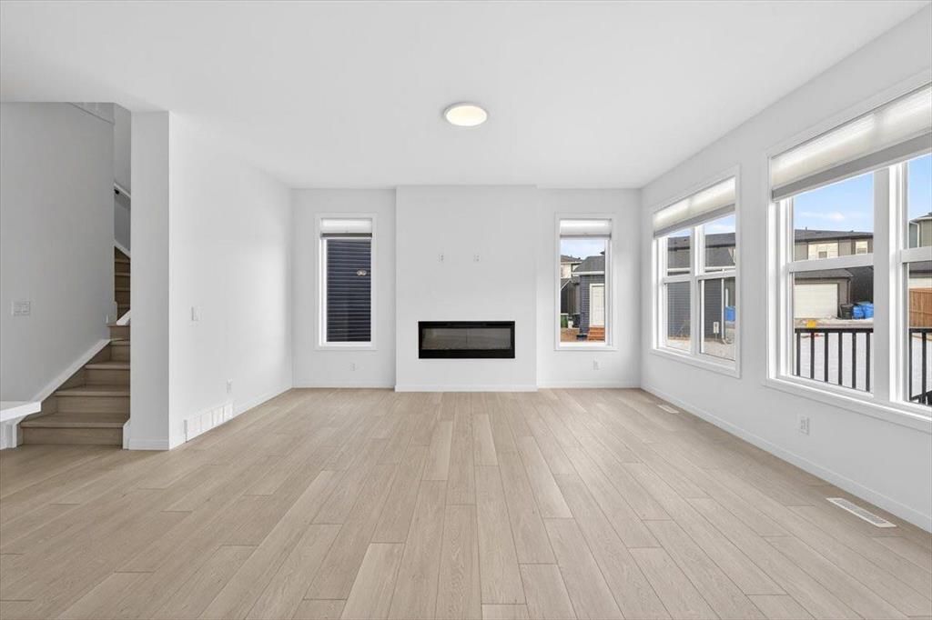 This exceptionally upgraded single detached residence in Carrington offers a refined balance of modern luxury, thoughtful design, and everyday functionality—perfectly suited for discerning homeowners seeking comfort, style, and long-term value. Step into an elegant open-concept main floor showcasing 9-FT CEILINGS, premium FLAT-CEILING finishes, and durable vinyl flooring throughout, combining timeless aesthetics with effortless maintenance. Nearly all light switches have been upgraded to smart switches, enhancing convenience and modern living. HIGH-END window coverings add both style and privacy throughout the home. The main living area is anchored by a sleek electric fireplace, adding warmth and contemporary charm, while OVERSIZED WINDOWS and strategically placed pot lighting fill the space with natural light.