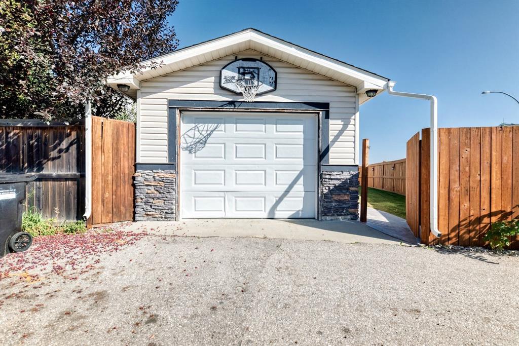 One of the standout features is the garage setup — a double attached front garage plus a single detached garage with paved alley access.
