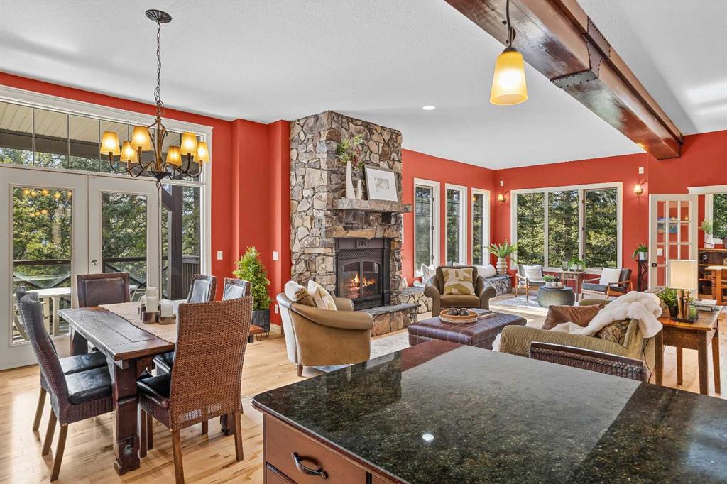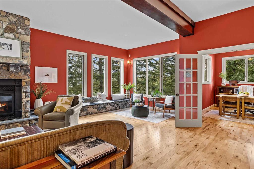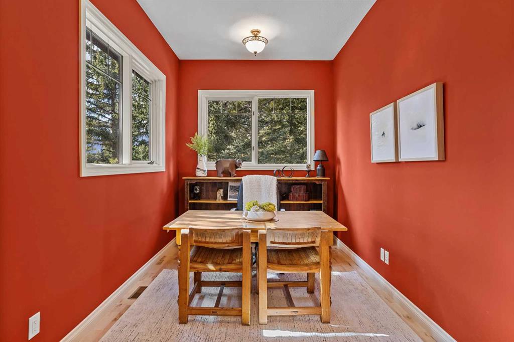 From the moment you step inside, the pace of life slows down. The main floor is anchored by a Rundlestone fireplace, with big windows that bring the outside in and an open-concept kitchen and dining area designed for easy entertaining, framing uninterrupted views of the valley below from morning through to sunset. Tucked into the trees on the main level, a window-wrapped office offers a genuinely inspiring place to spend a morning.