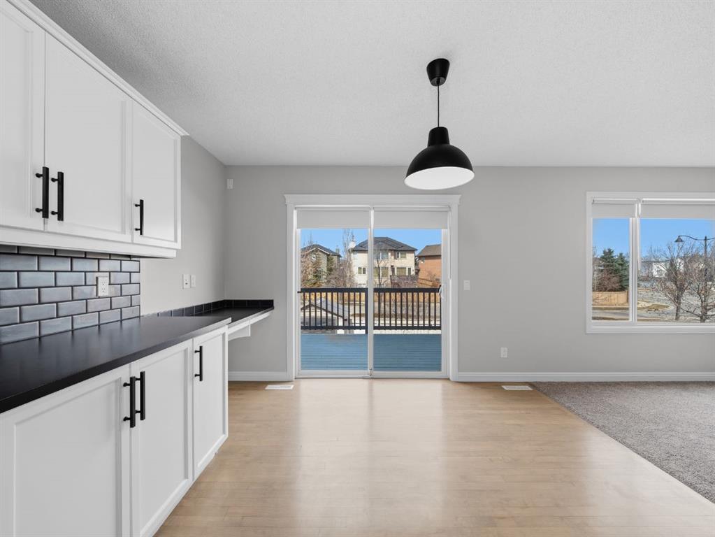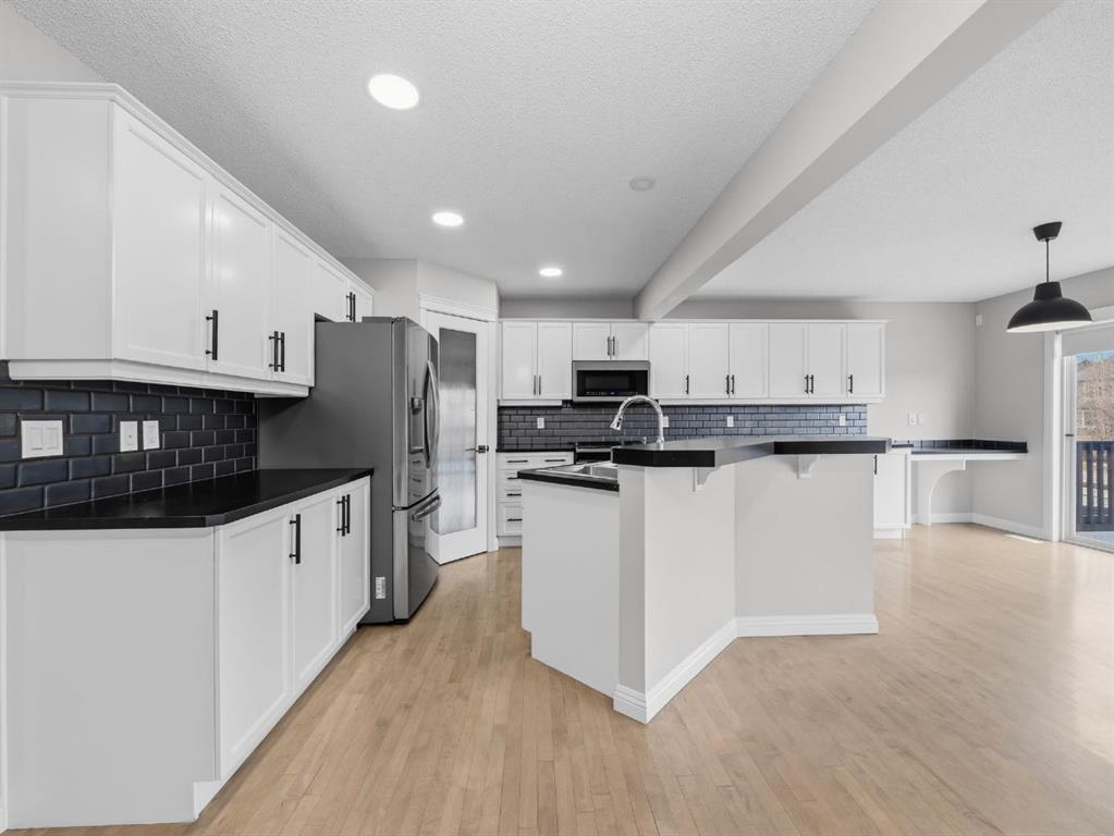 The inviting open-concept main floor is filled with natural light and showcases refinished hardwood floors, large windows, and fresh, contemporary finishes. The functional kitchen features a corner pantry, stainless steel appliances, a central island with breakfast bar, and a convenient built-in workstation that is perfect for working from home or helping with homework.