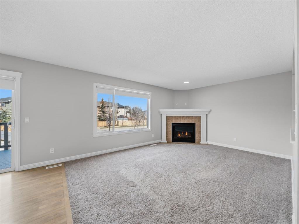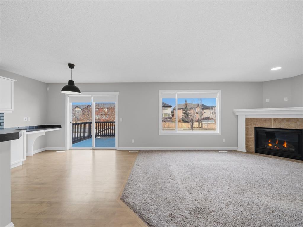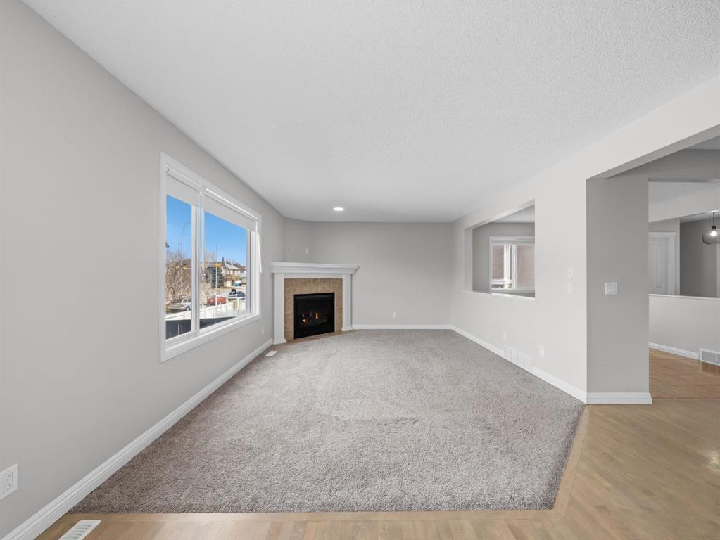 The cozy living room with gas fireplace flows seamlessly into the designated dining area, creating a welcoming space for everyday living and entertaining.