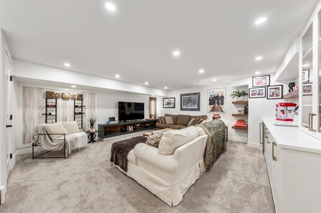Fully developed basement offers a comfortable lounge atmosphere with plush carpeting, a recreation area with wet bar, two additional bedrooms with walk-in closets, a fourth bathroom, and an additional well-appointed laundry space. Extensive upgrades include new subfloors, trusses, furnace, air conditioning, plumbing, electrical, and more—providing peace of mind for years to come. A double detached garage is located off the rear alley, and utilities have been relocated underground for added functionality and curb appeal.