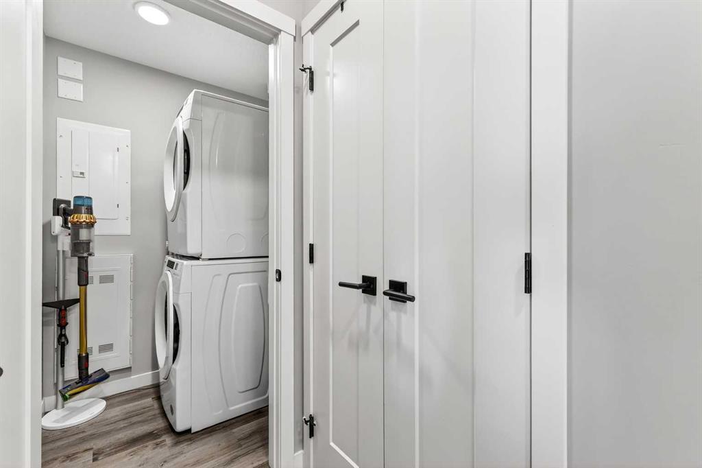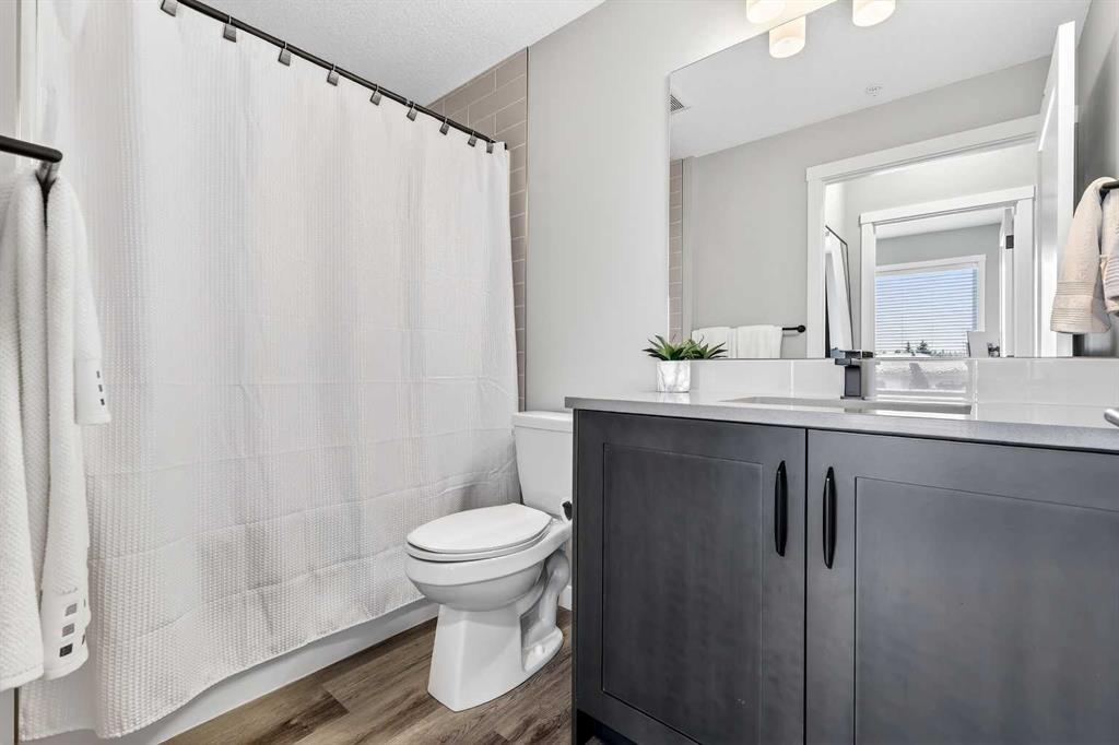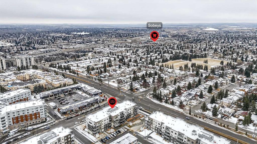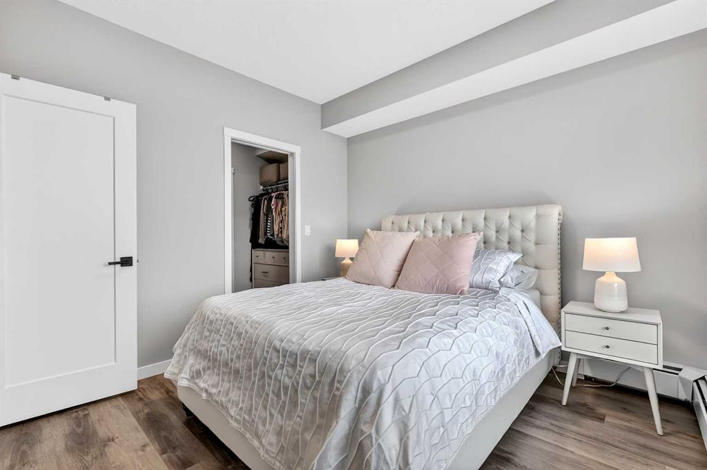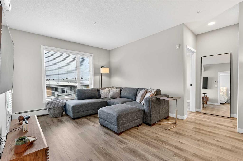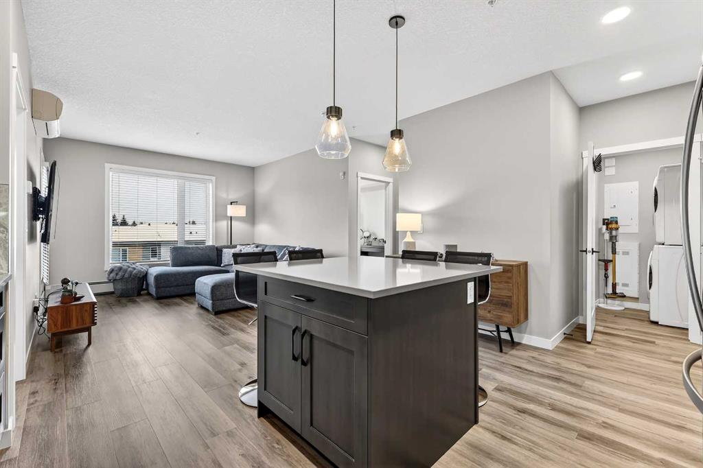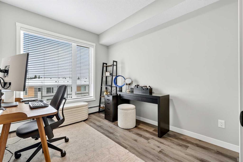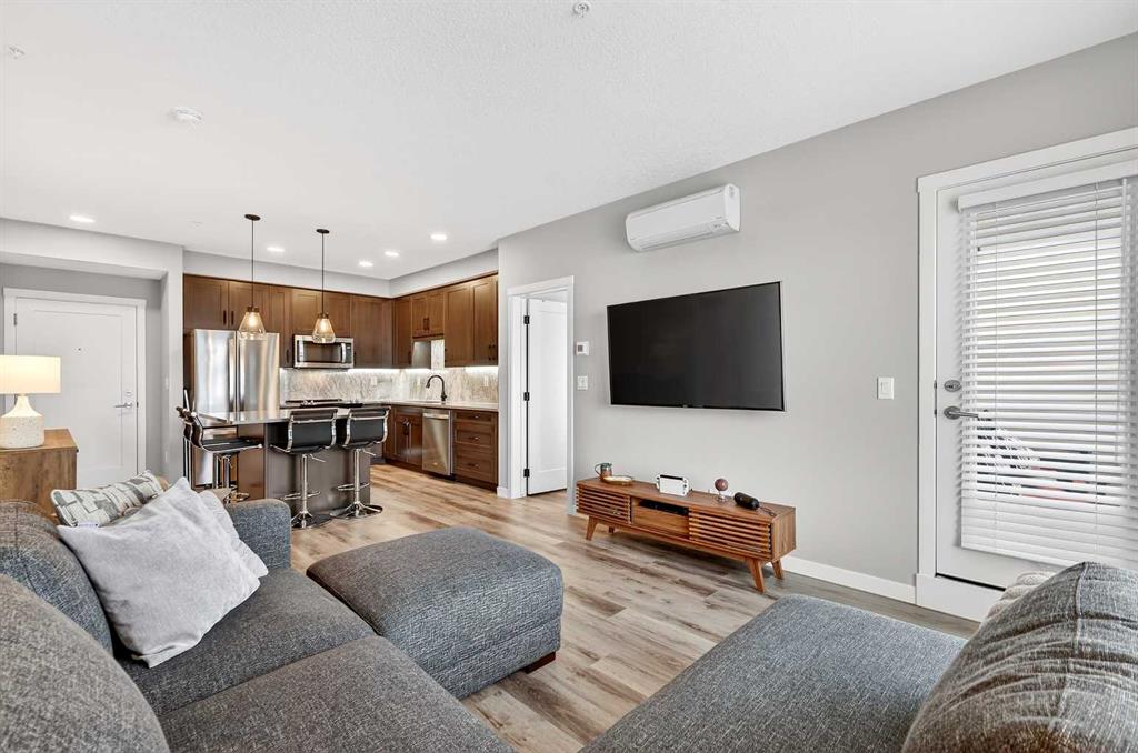 Welcome home to Park South at Fish Creek Exchange in the unique community of Shawnee Slopes. This gorgeous top floor, 2-bedroom, 2-bathroom, 790 sqft (852 sqft Builder Size) condo is full of upgrades! Luxury vinyl plank flooring flows seamlessly throughout the unit (no carpet!), 9’ ceilings, and two air conditioning units to keep you comfortable during the hot Calgary summers. The kitchen features beautifully upgraded shaker style cabinets, quartz counters, upgraded appliances including a no-back oven range, offering a sleek look and allowing more of the upgraded backsplash to be seen. Undercabinet lighting adds another level of luxury and convenience in the kitchen. The thoughtful design of the kitchen island allows additional storage and room for four stools perfect for meals and entertaining. Throughout the condo the plumbing and lighting fixtures, as well as the cabinet hardware have all been upgraded to a stylish matte black. The living room provides plenty of space for your furniture to make it feel like home. The balcony is offset from the neighbours allowing for privacy and includes a gas line for a bbq. The primary bedroom has its own AC unit allowing you to set the perfect temperature while you sleep. The large walkthrough closet was thoughtfully designed having a pocket door to the bedroom, and a separate door to the bathroom. The 3-piece ensuite features a walk-in shower, black fixtures, and quartz counter. The second bedroom is a great size whether you use it as a bedroom, guest room, or office. After a long day, relax in the bath of the 4-piece main bathroom. Both bathrooms have been upgrades with tile installed to the ceiling allowing for easy cleaning. This condo includes a titled parking stall that is conveniently located right beside the door to the elevator. It also includes a titled storage locker, and access to secure bike storage. Enjoy the shared patio and bbq to the right of the building doors and enjoy gardening in the community garden within the complex. Shawnee Slopes was designed with luxury living and nature in mind. A pathway system surrounds most of the community, direct access to Fish Creek Park is less than a 10 minute walk, plenty of amenities are directly across the street, or a 15-20 minute walk to Millrise Sobeys, Shoppers Drug Mart, Starbucks, and more! The Fishcreek-Lacombe C-Train Station is a 10 minute walk and there is convenient access to the ring road (Stoney Trail) or Macleod Trail. Book your showing today!