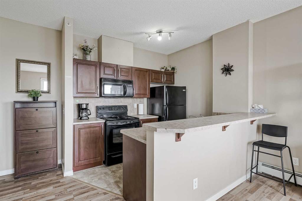 Discover the perfect blend of comfort and convenience in this bright and spacious one-bedroom condo at Bella Casa. Situated on the top floor, this corner unit offers an open layout with 9 ft. ceilings and plenty of natural light. The kitchen features ample cabinetry and a raised breakfast bar, opening into a cozy living room complete with an electric fireplace. Step outside onto your private balcony to enjoy breathtaking views of downtown Calgary and the mountains. The generous primary bedroom includes a walk-through “His & Hers” closet leading to a 4-piece bathroom. This home also comes with titled underground parking, plus visitor and handicapped parking for your guests. Bella Casa residents enjoy access to a central courtyard with a gazebo and BBQ area, perfect for relaxing or entertaining. The building is pet-friendly (with board approval) and ideally located close to shops, restaurants, and transit, with quick access to downtown Calgary. Condo fees conveniently cover all utilities except electricity. Available for immediate possession – don’t miss this opportunity to make Bella Casa your new home.