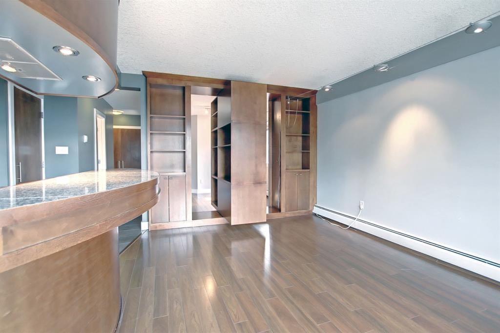 Welcome to this stylish and thoughtfully designed, top-floor 1-bedroom, 1-bathroom condo in the heart of Lower Mount Royal offers unbeatable location and charm just steps from 17th Avenue. Featuring custom woodwork throughout, including built-in bookshelves and a unique revolving media center that allows for a 60″ TV viewable from both the living room and bedroom, this open-concept suite is filled with character and function. The bright west-facing layout includes oversized patio doors leading to a large balcony—perfect for entertaining with great views, sunshine, and space for a BBQ and patio set. The kitchen boasts a granite breakfast bar, ample cabinetry, a built-in wine rack, and tile flooring, while in-suite laundry adds everyday convenience. With assigned parking, extra storage, and stunning curb appeal in a well-maintained building, this condo is ideal for first-time buyers, professionals, or investors looking to enjoy one of Calgary’s most desirable inner-city neighborhoods.