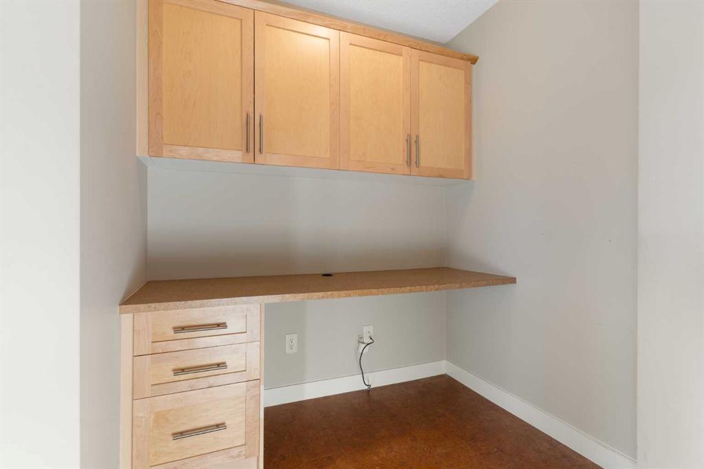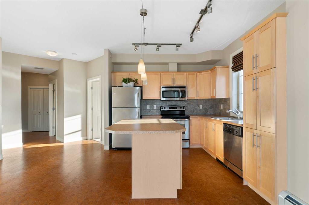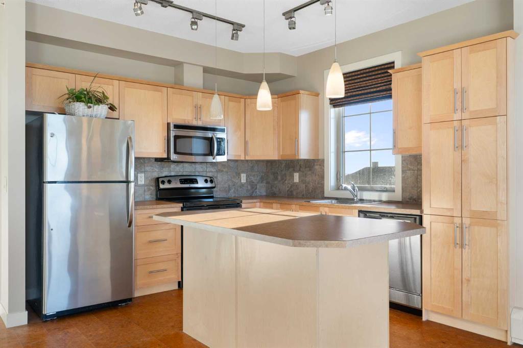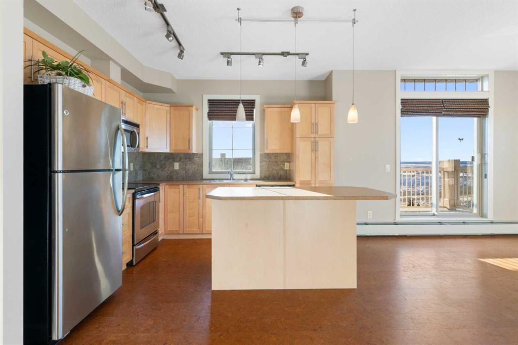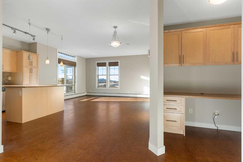 180-DEGREE PANORAMIC MOUNTAIN VIEWS! Experience the pinnacle of condo living in this rare top-floor corner unit, specifically positioned to offer breathtaking views and stunning sunsets. As a premium corner residence, this home features extra windows on two sides, flooding the open-concept design with amazing natural light. The interior boasts 9-foot ceilings and upgraded cork flooring throughout the main living areas. The chef-inspired kitchen is complete with stainless steel appliances, elegant maple cabinetry, a large eat-up island, and abundant counter space. The spacious primary suite easily accommodates a king-sized bed and features a walk-in closet and a private 3-piece ensuite. A second bedroom, a 4-piece main bath, and a versatile flex den/tech-centre provide the perfect layout for a home office or guest space. Enjoy summer evenings on the balcony with a built-in gas BBQ hook-up. This unit includes two titled parking stalls—one heated underground stall located right beside the elevator with a private storage locker, plus an additional surface stall. Building amenities include double elevators and access to a fitness room. A rare top-floor gem offering unmatched comfort, convenience, and unbeatable mountain vistas.